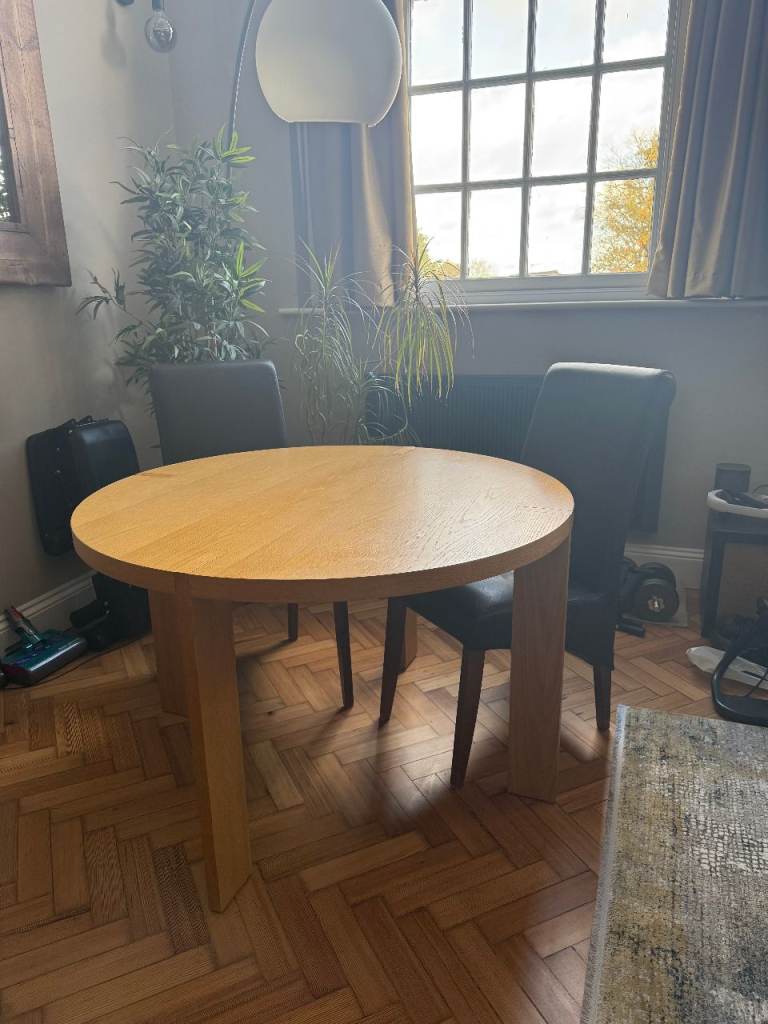 Dwell round dining table. Oak (possibly oak veneer). Good condition. Free to collect from London N13.