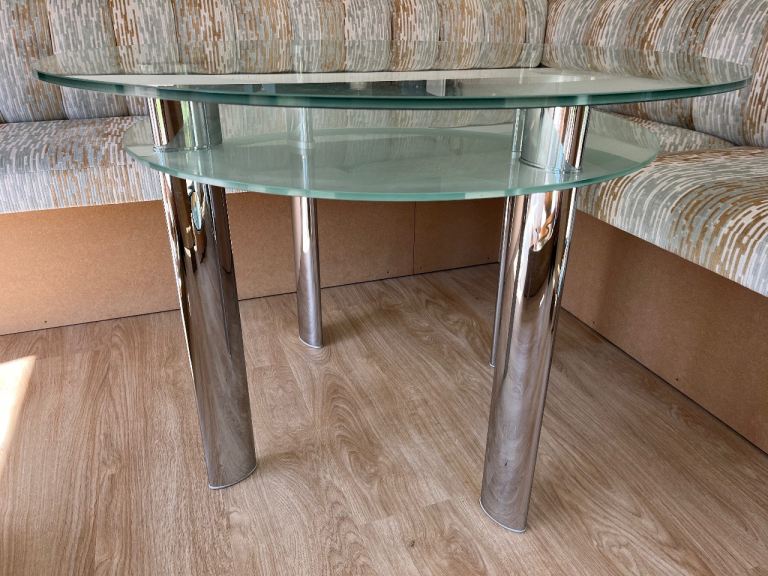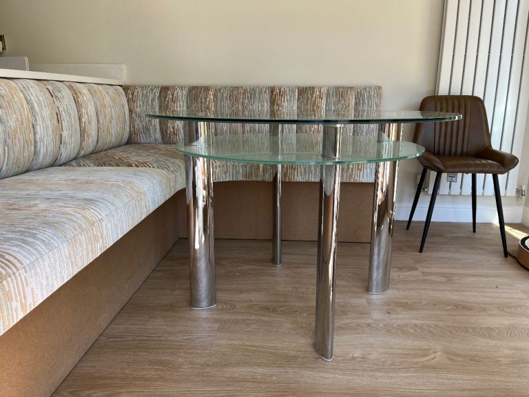 Round glass dining table with shelf