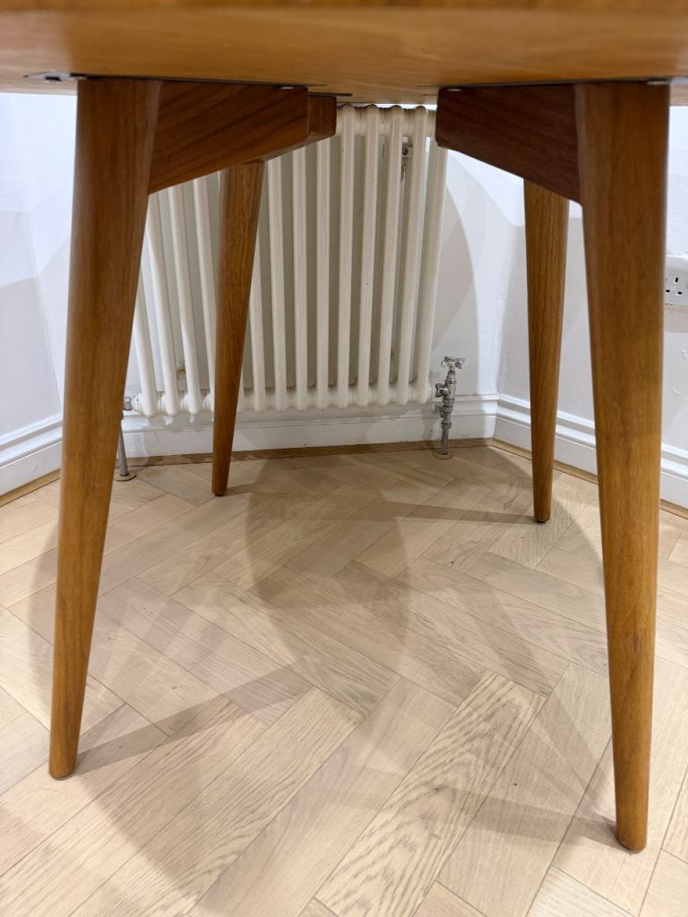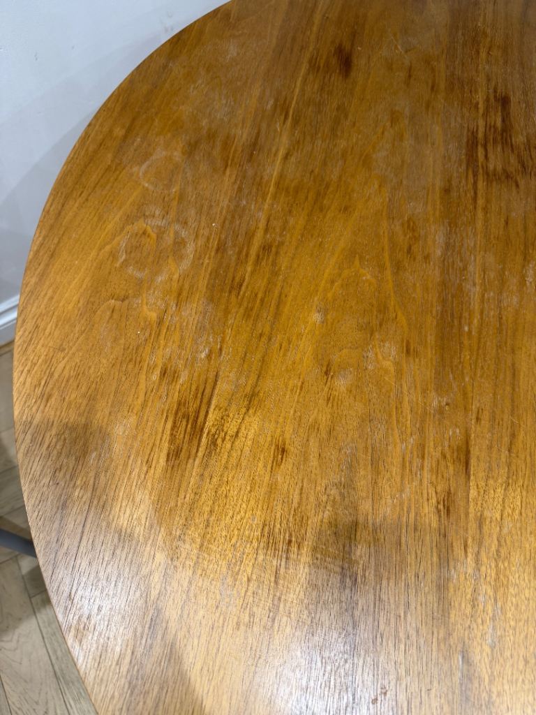Solid wood round table. Legs come off easily for transporting. Watermarked and signs of use, reflected in the price.