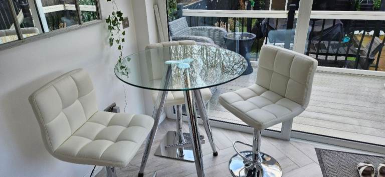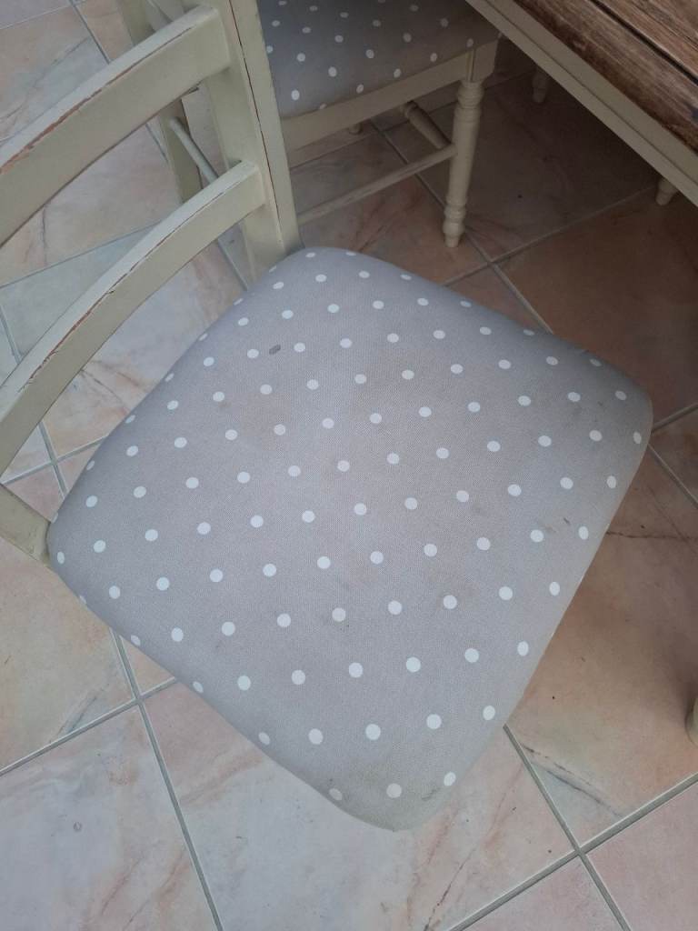 Chairs: 6 matching chairs with polka dot seat pads. These are easily unscrewed if you want to reupholster them in your own fabric.