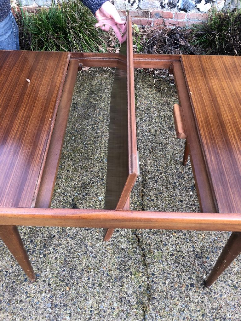 The table extends quickly and easily by simply pulling the two halves apart which reveal the hidden extension leaf, this swivels upwards, the table can then be pushed back together to achieve the desired size, seats up to 6 people.