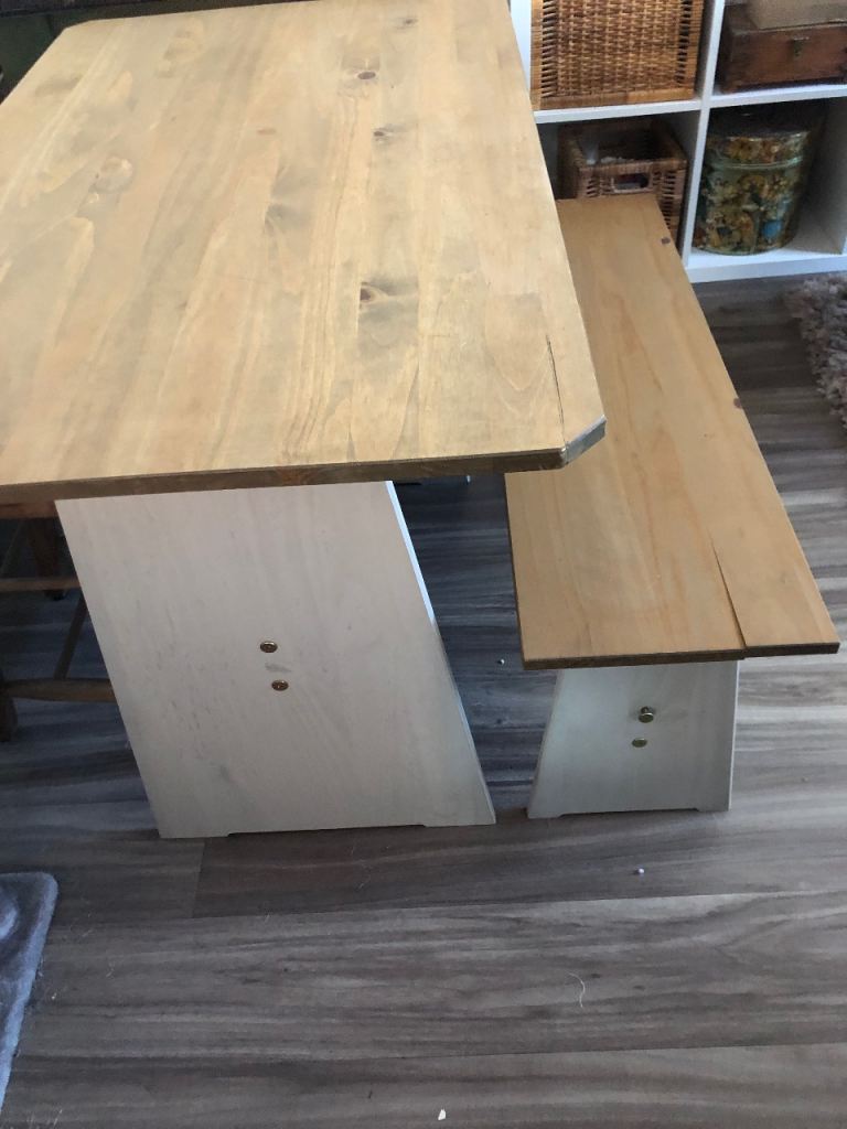 Wood effect top, with grey legs . Ideal for small spaces , it’s dismantled ready to go .