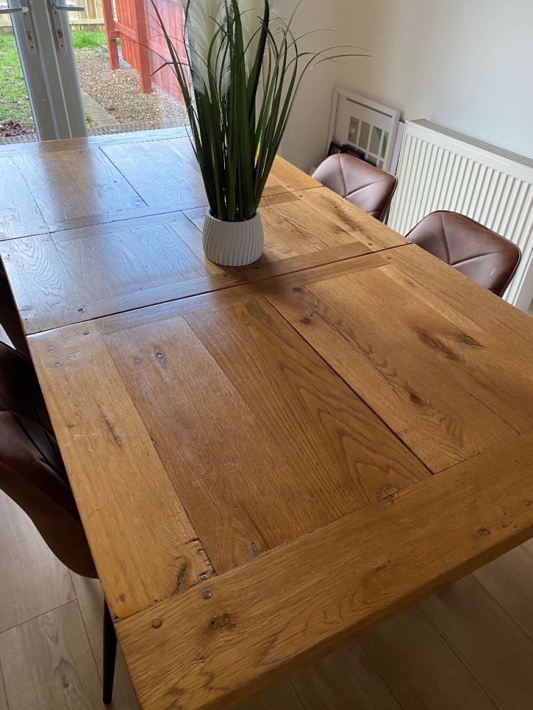 Solid oak dining table (chairs not included) In the photos it is fully extended 180cm (6ft)