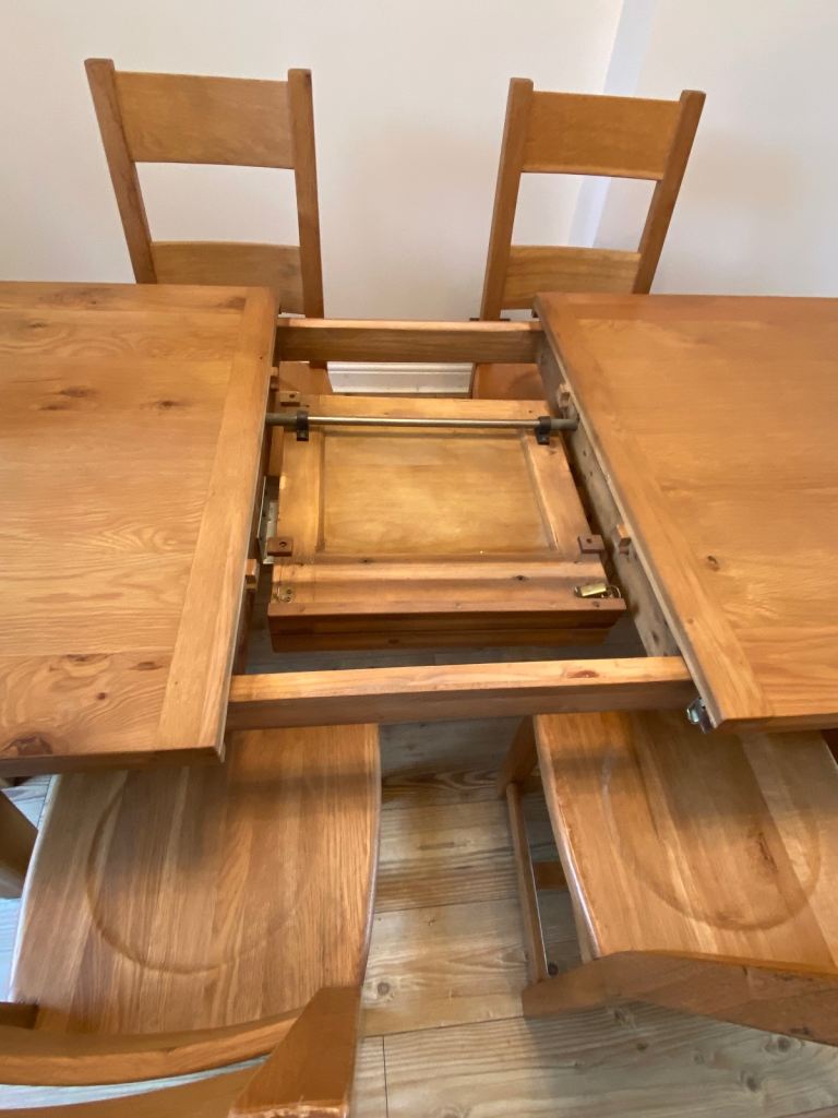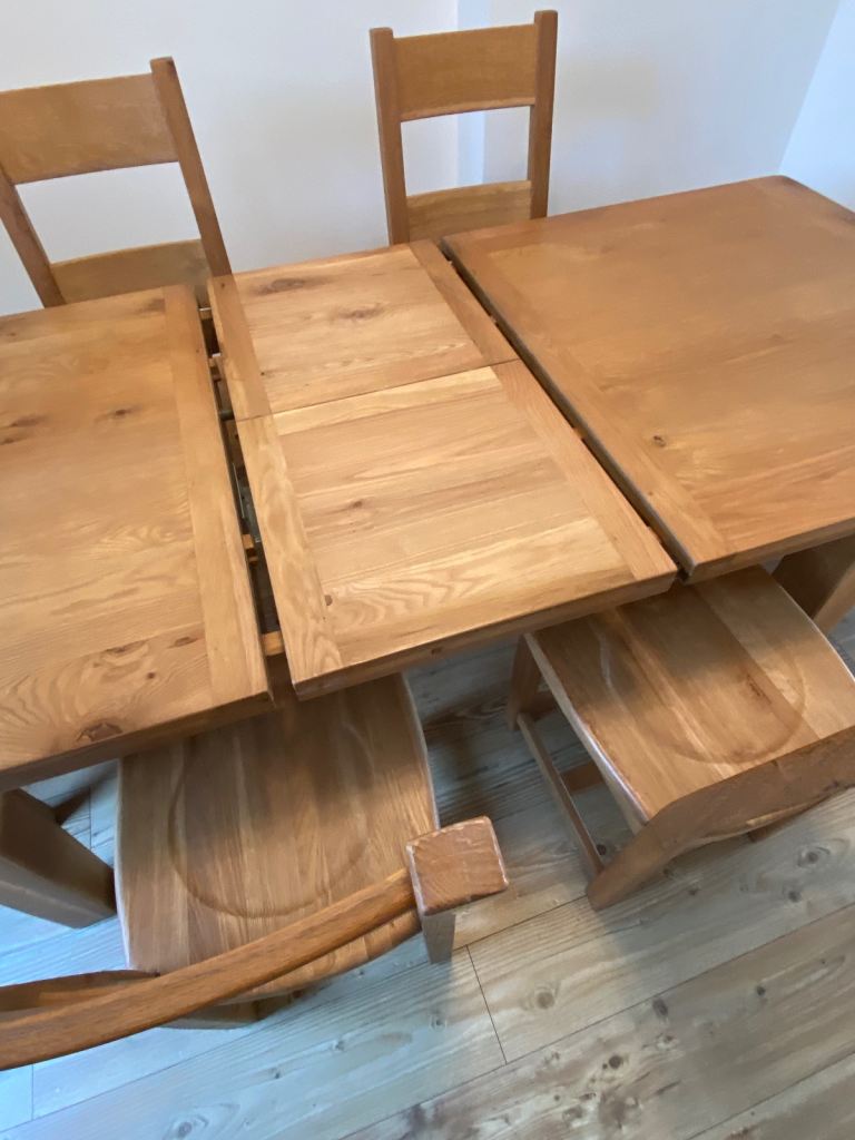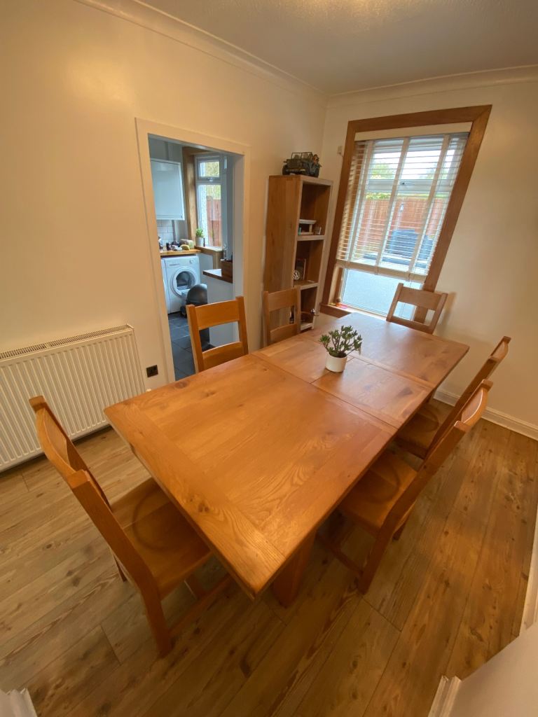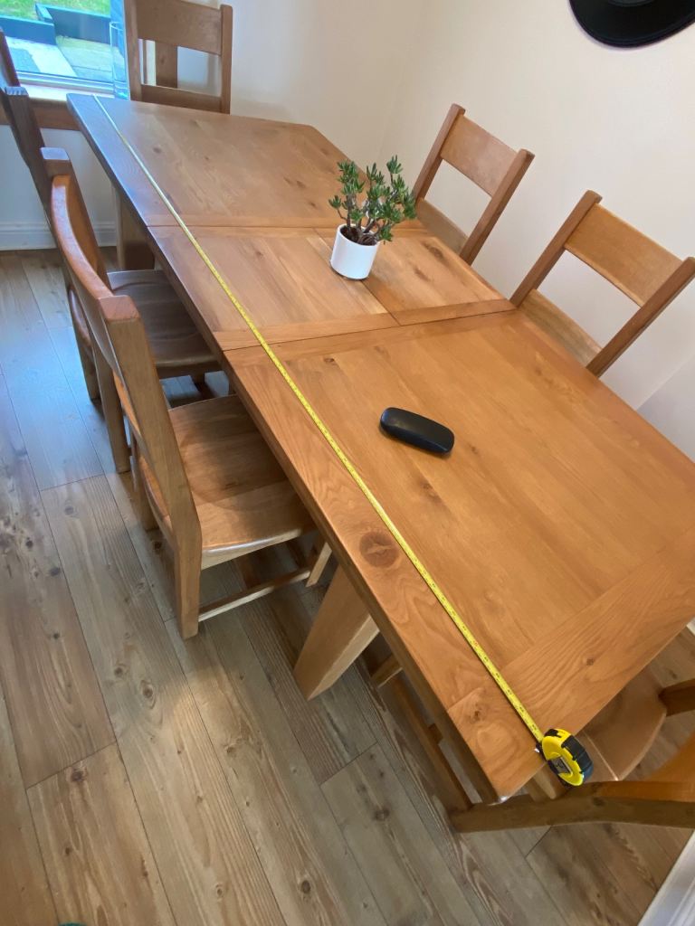 Solid oak extendable dining table with 6 solid oak chairs.Table measures 6ft x 3ft normal and extends to 7ft 6 inch.Originally purchased from the Living Room for £1200.Very heavy item and would require 2 persons to handle.The legs can be removed for easy transport.