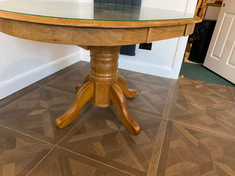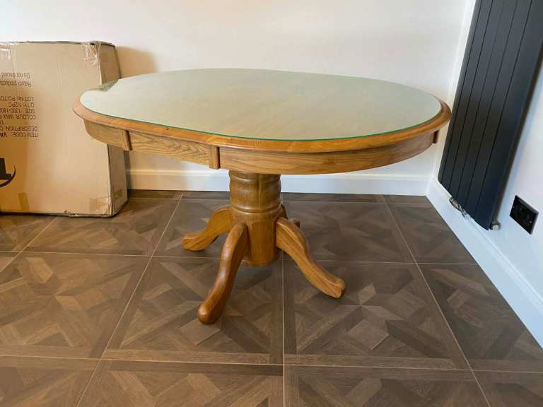 Absolute bargin, 6 months old, no marks on it at all, IMMACULATE. Only selling as it doesn't match new kitchen. Solid oak dining table with perpex top protector. Table was £650 perpex top was £100