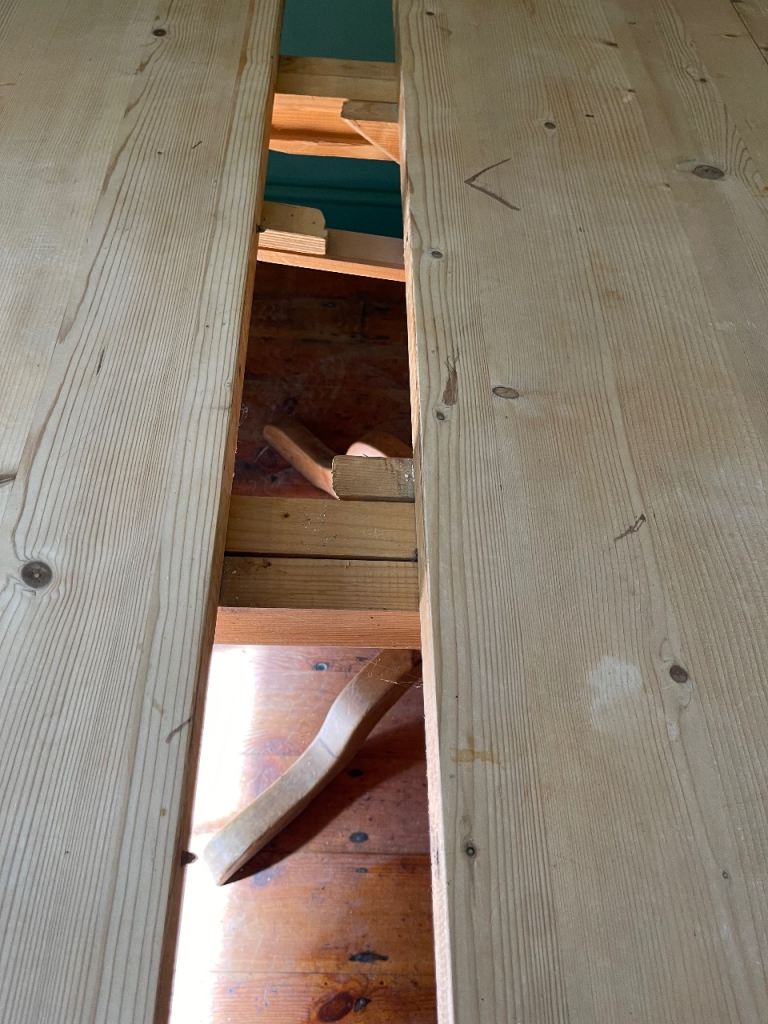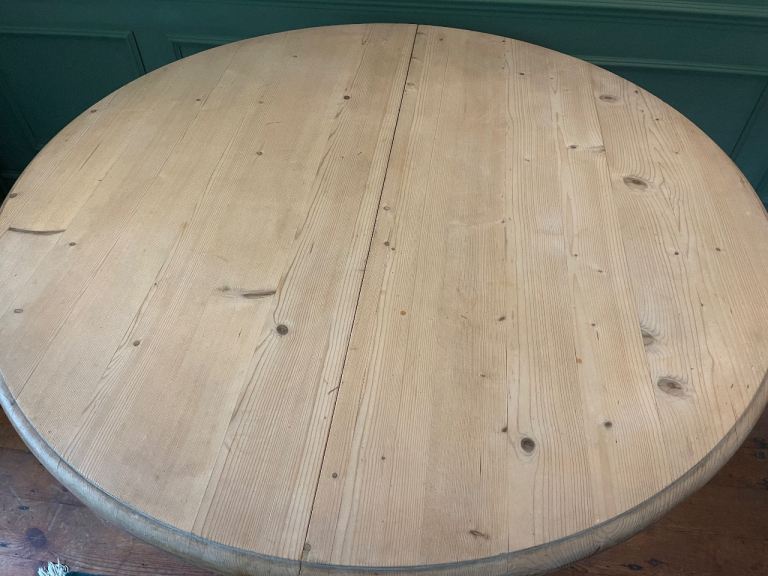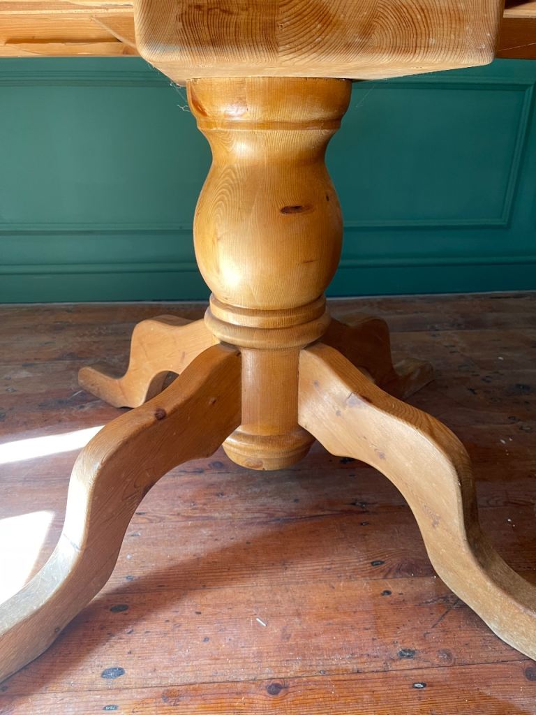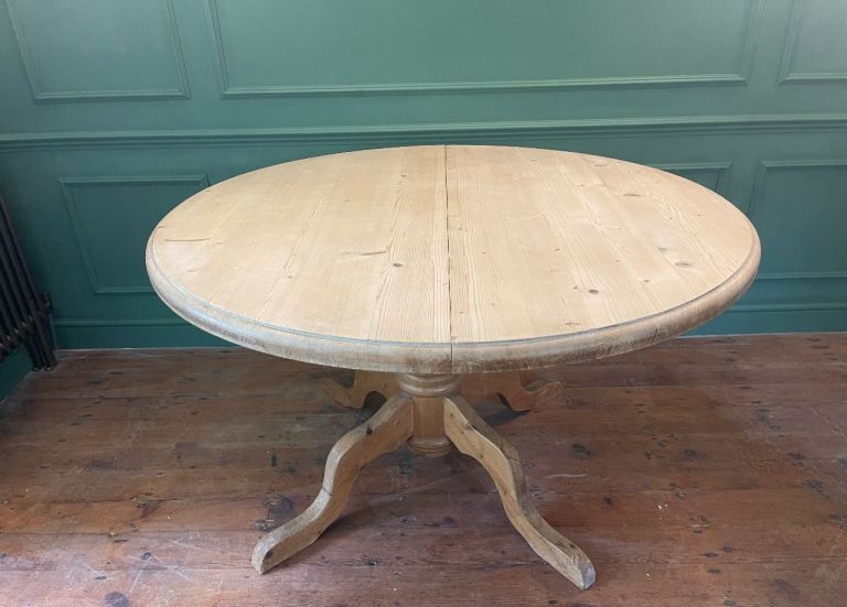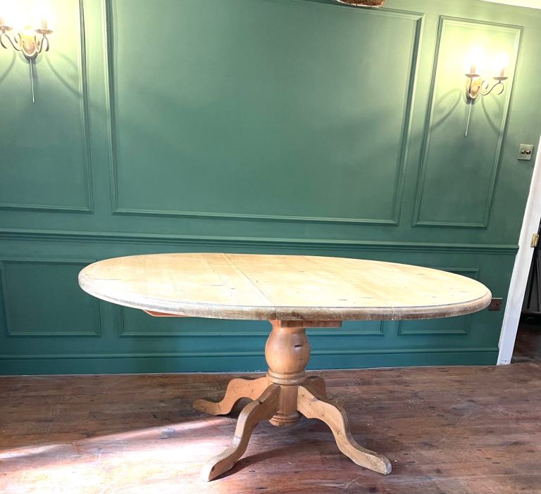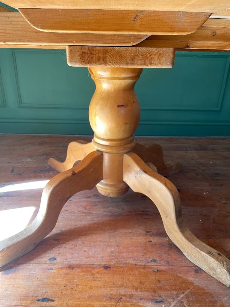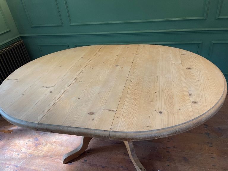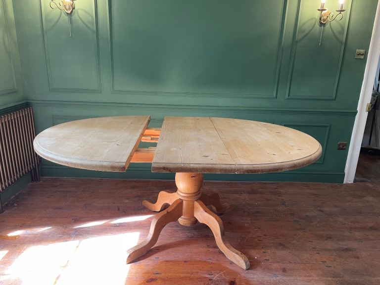 Lovely chunky solid pine dining table on pedestal base. Can be circular or oval with the addition of the centre leaf.