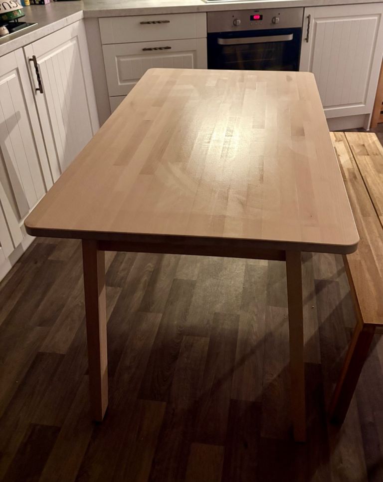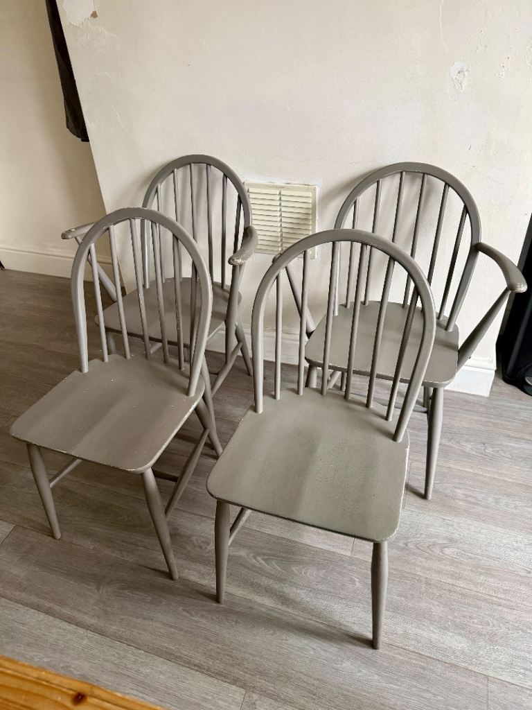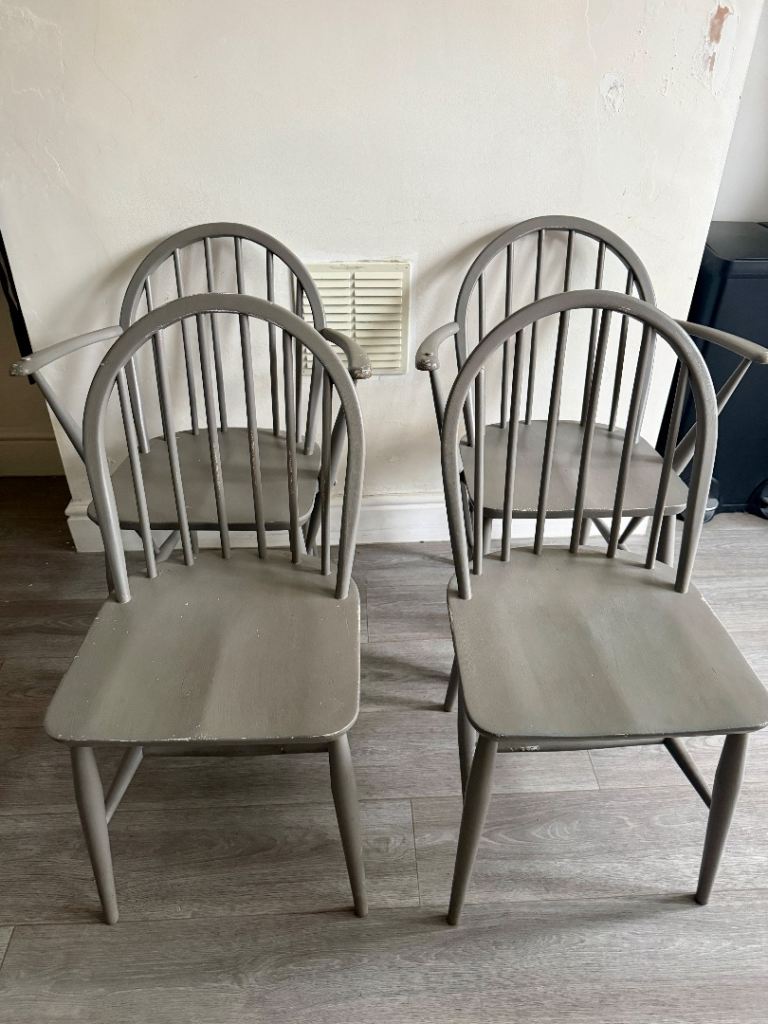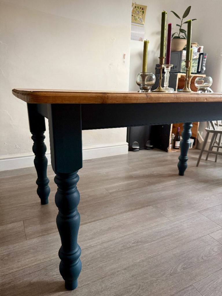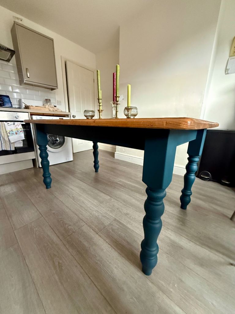 Stunning farmhouse style dining table. Seats 6 very comfortably, 8 if you need it to. Selling along with four very sturdy chairs that are great for an upcycle.
