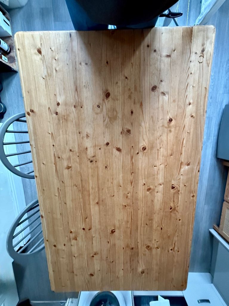 The top has been freshly oiled and the skirt and legs have been freshly painted. (The paint will come with for touchups or for the chairs.)