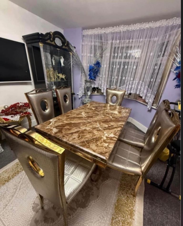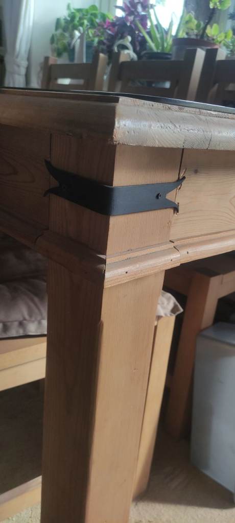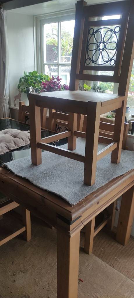 In a Mexican style due to the black metal infills. Lovely condition as has been used with a glass protector (included if required). Complete with 6 matching chairs although big enough to seat more.