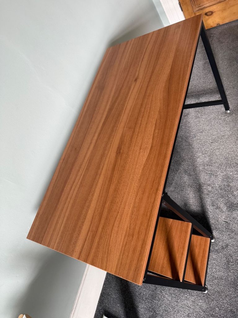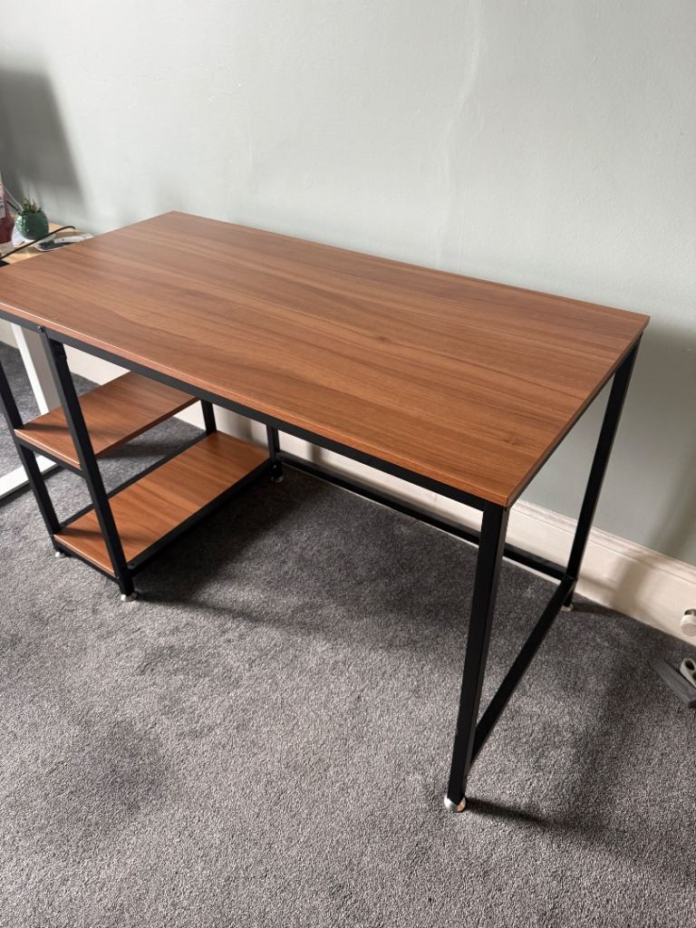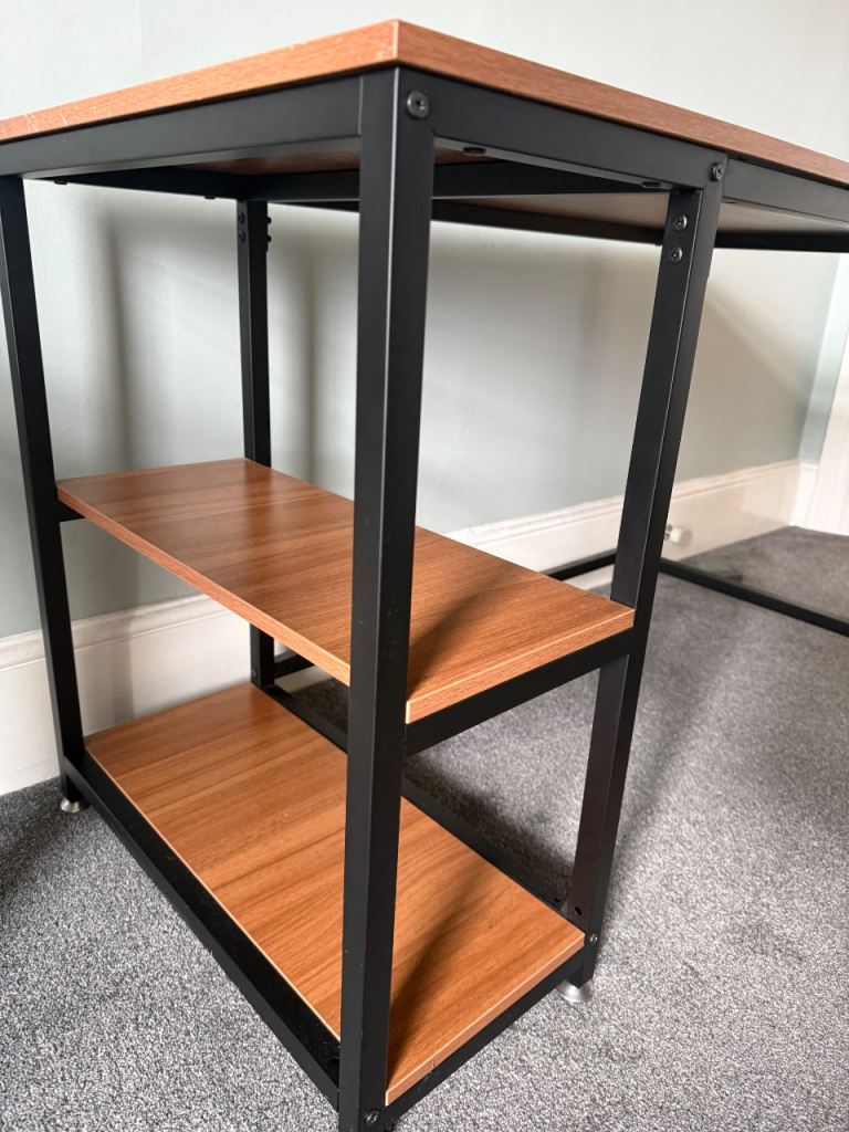 Compact table with built-in storage shelves. Similar in size to a computer desk but more versatile – great for study, home office, or general storage. Good condition.