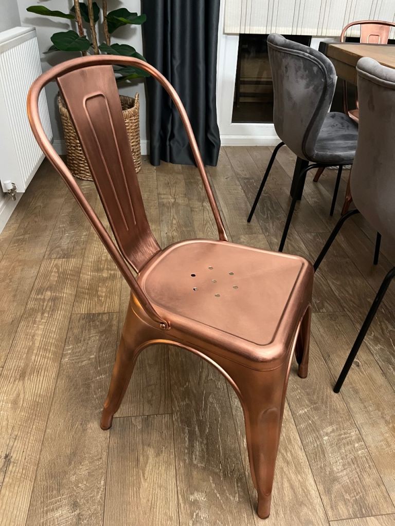• 2 Elegant Side Chairs – industrial look , tolix style metal chairs , finished in copper spray paint.