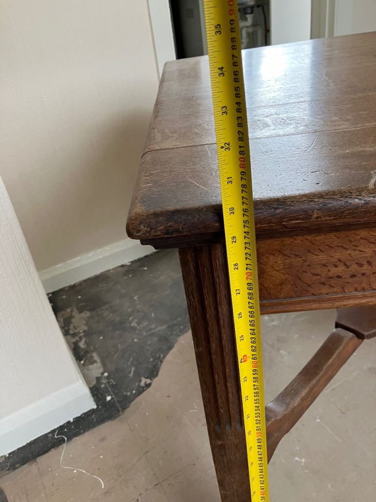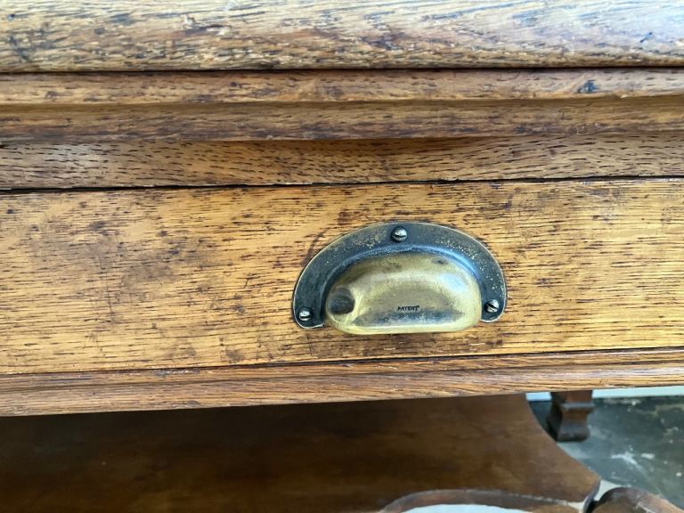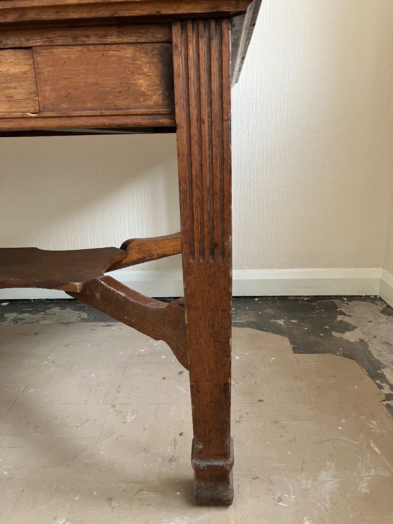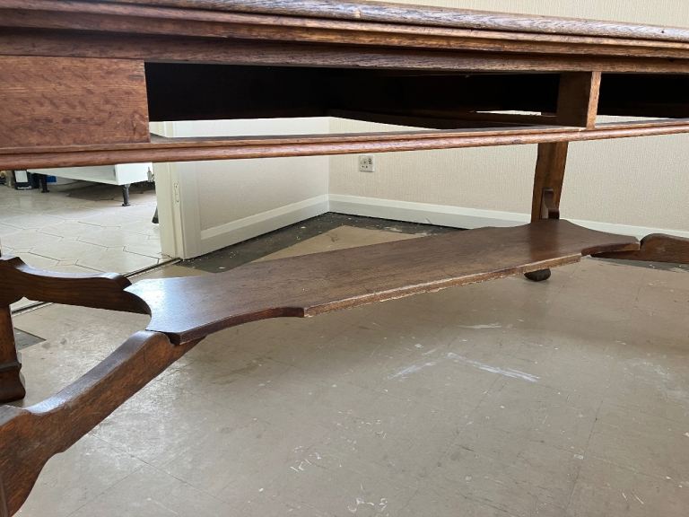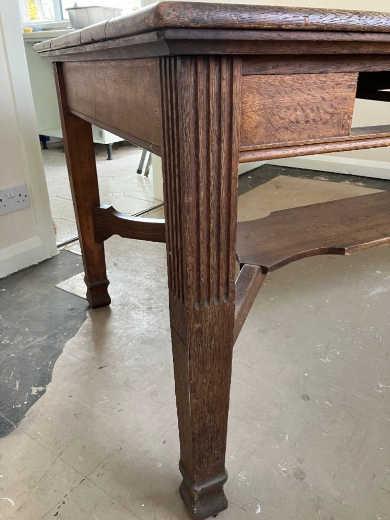 It has some very nice touches, has you can see from the photos, storage drawers, mid height shelf which stiffens the fluted recessed grooved legs all made from the tried and tested Oak Timber. This table will out strip any of today’s fabrication and will still be around many years from now.