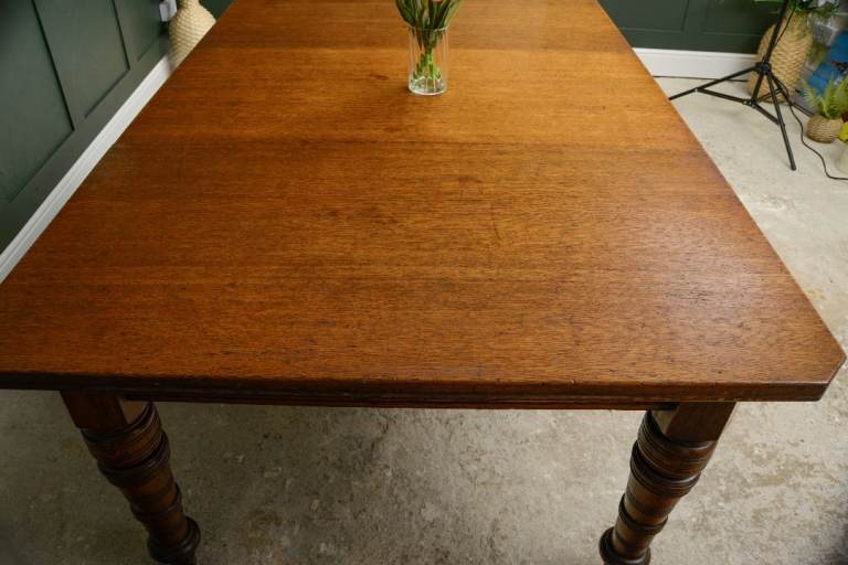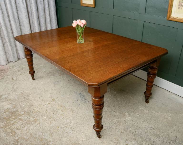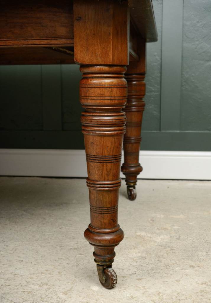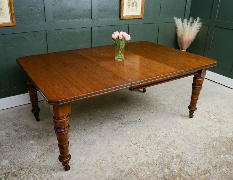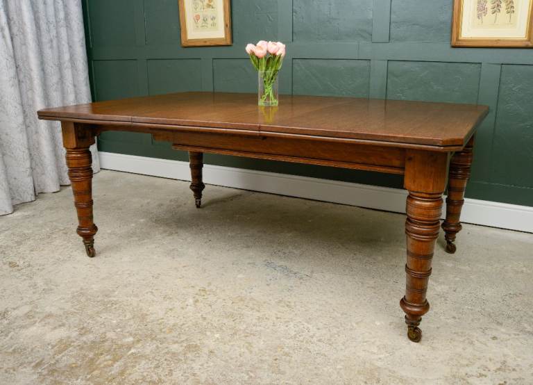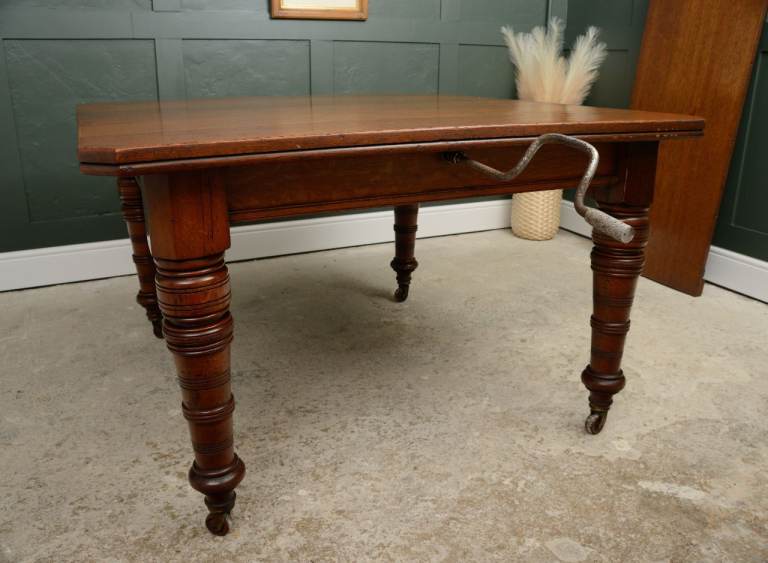 An antique Victorian very heavy solid oak wind out extending dining table with one extension leaf. The legs are on castors. The leaf cannot be stored within the table, so you will need somewhere to keep this when not in use. Please note that this table doesn't come apart, so please make sure that your access is adequate before ordering.