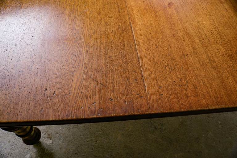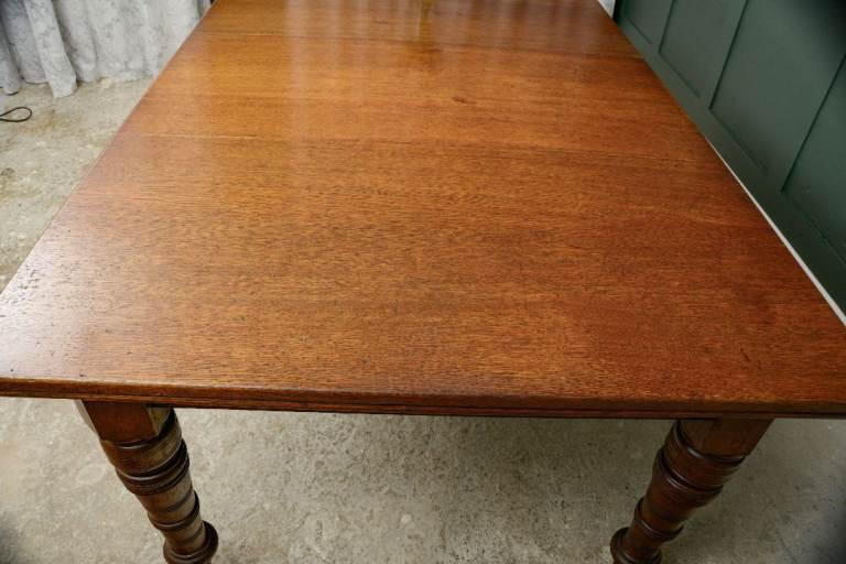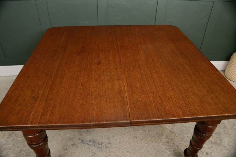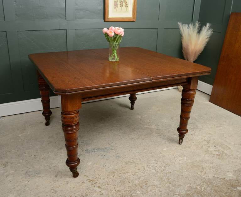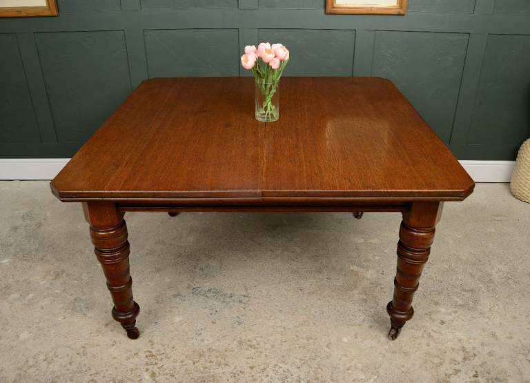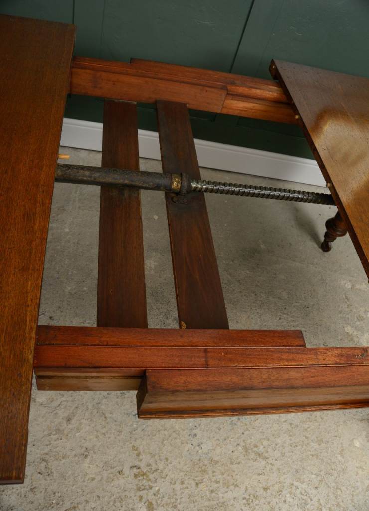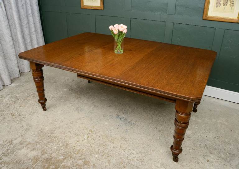 An antique Victorian very heavy solid oak wind out extending dining table with one extension leaf. The legs are on castors. The leaf cannot be stored within the table, so you will need somewhere to keep this when not in use. Please note that this table doesn't come apart, so please make sure that your access is adequate before ordering.