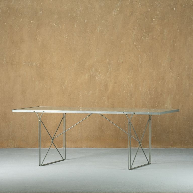 Stainless steal frame which supports a large glass top that is frosted on one side.