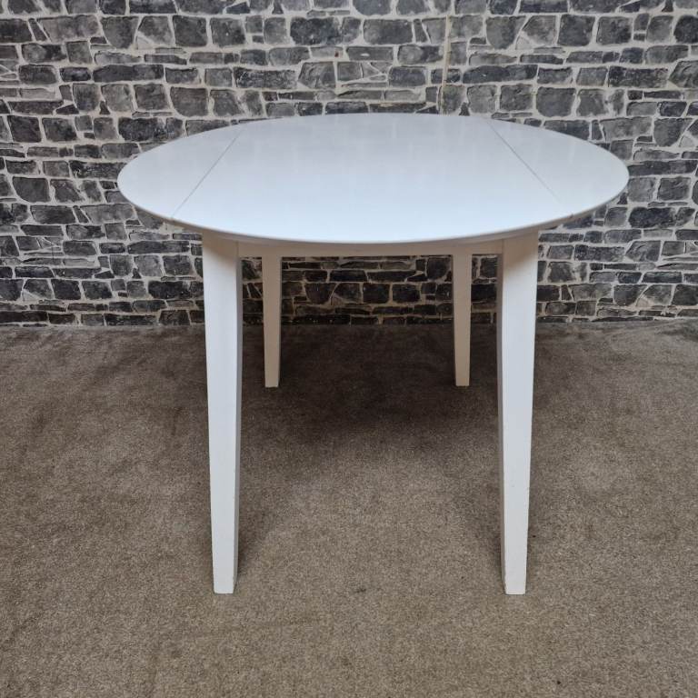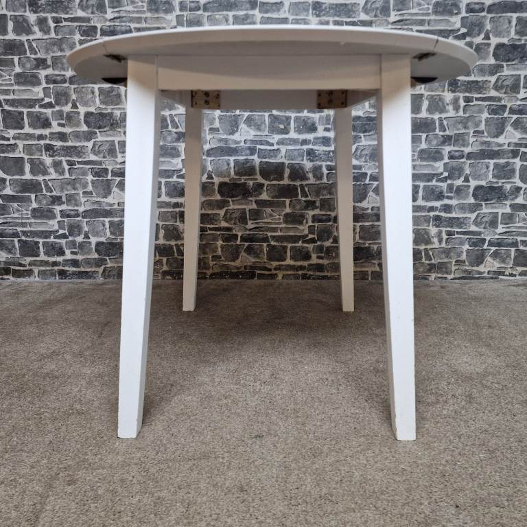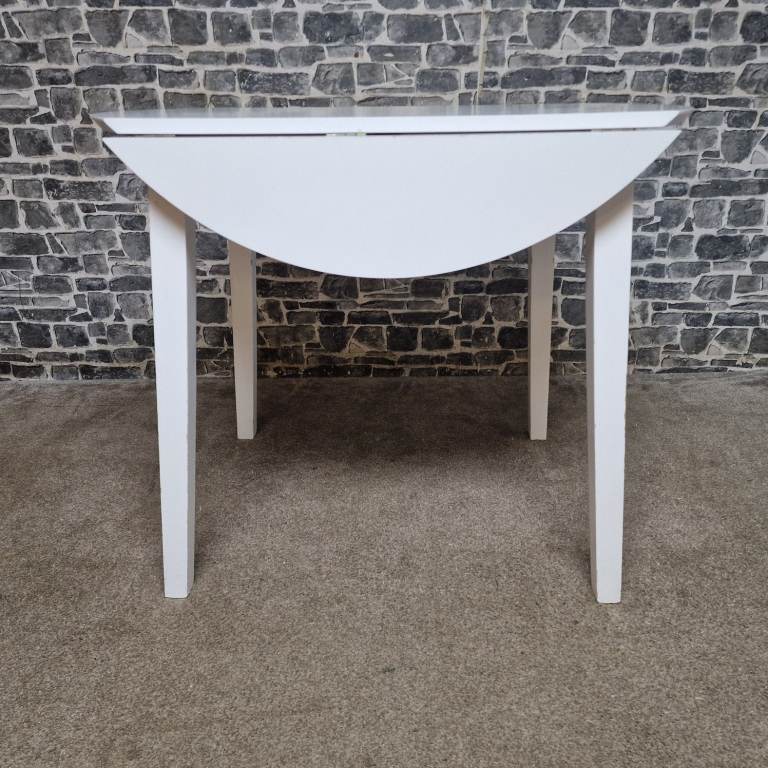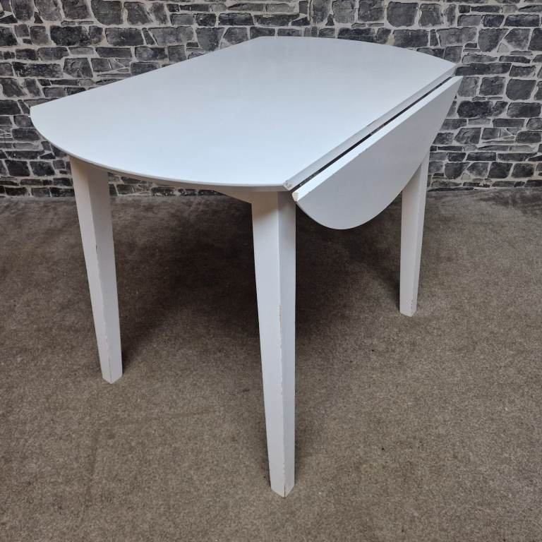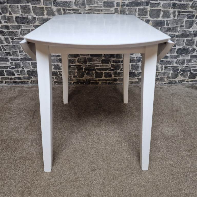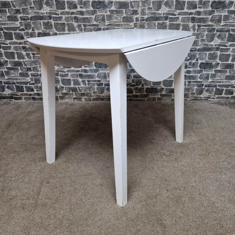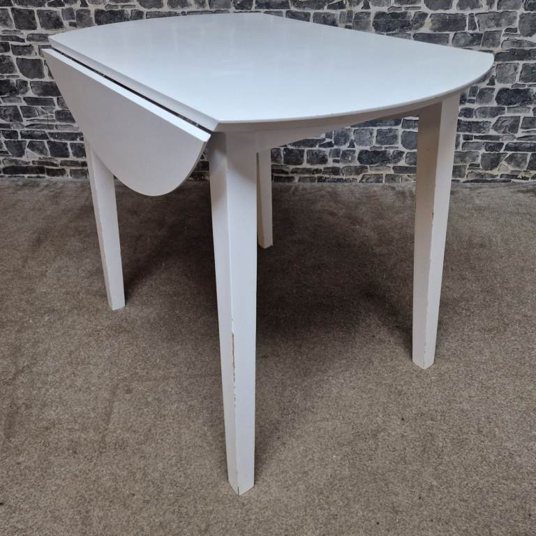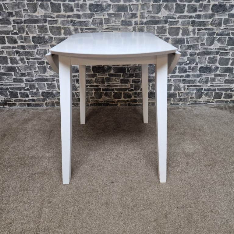 White drop leaf dining table with folding sides, perfect for smaller kitchens or dining areas. The side leaves fold down neatly, making it ideal for saving space when not in use, and can be extended when you need extra surface for meals or guests.