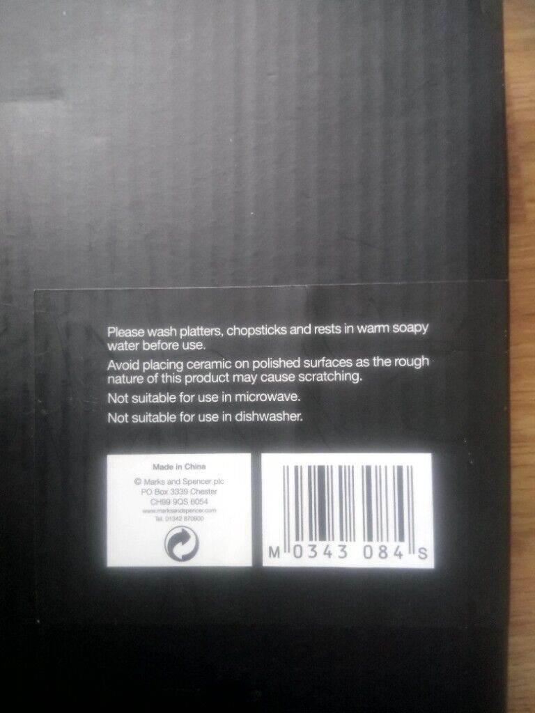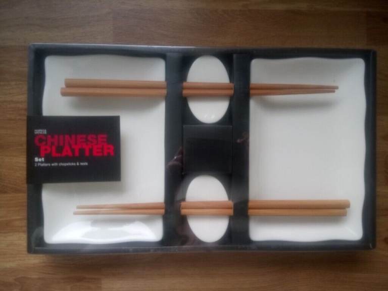 Chinese platter gift set containing 2 each of chopsticks, rests, and platters from Marks & Spencer.