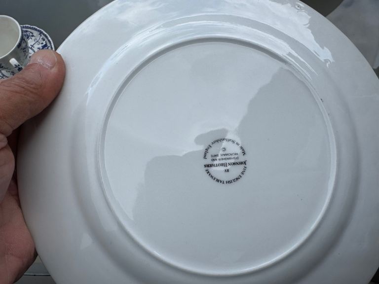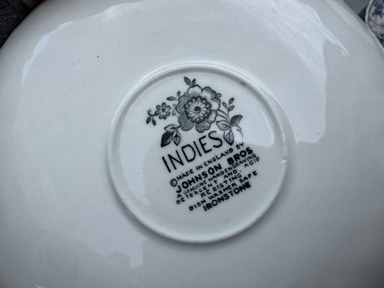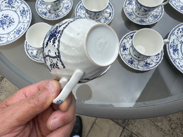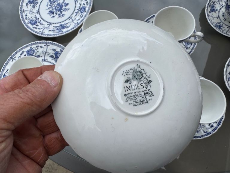 I have for sale 6 cups and sauces +4 side plates which measure 22 cm in diameter. These are the blue and white Indies pattern.