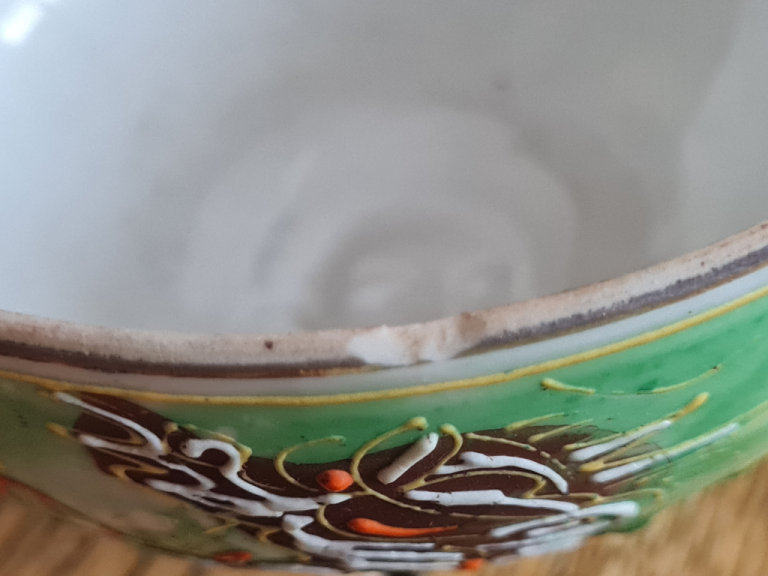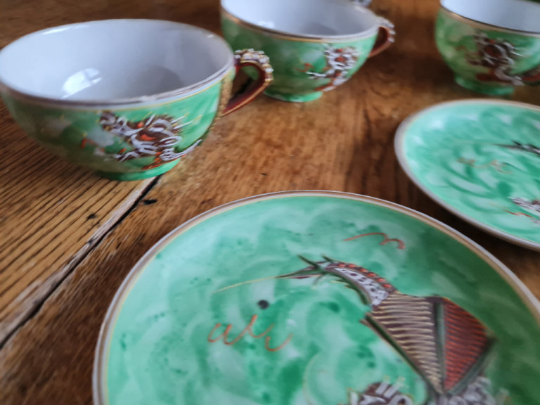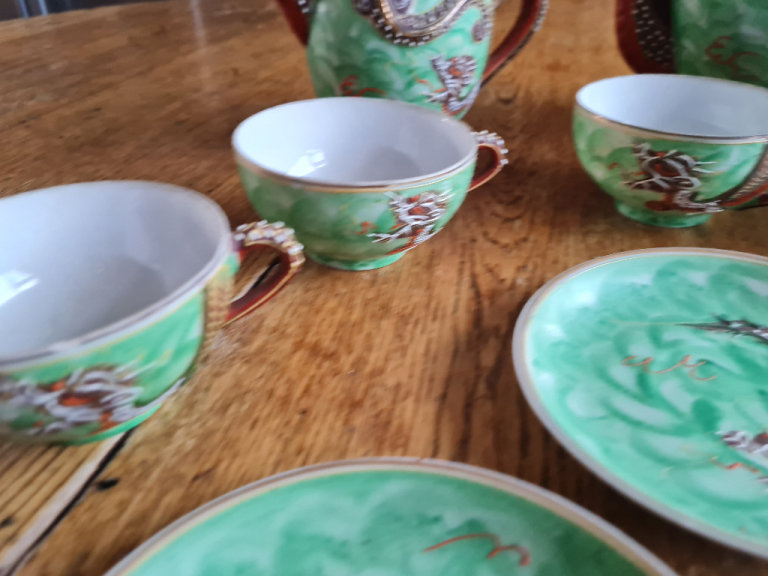 Beautiful and very sought after vintage hand painted dragonware crockery from Japan. The tea cups have an imprint of a Japanese lady on the bottom and are very delicate. The crockery is in perfect condition, no cracks or chips except two of the cups which have a small chip each on the rims, please see photo's. The set comprises:-