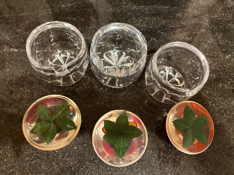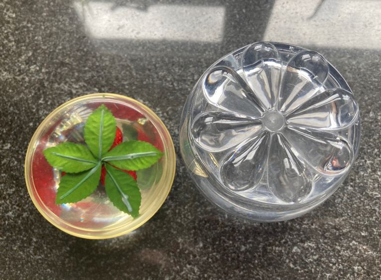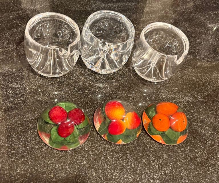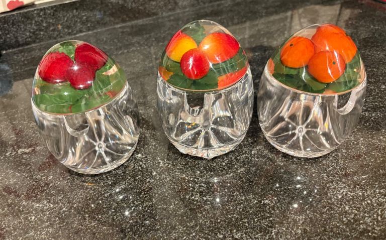 These mid century modern jam or preserve pots were popular in the 1960s and 70s. They feature clear Lucite(acrylic) jars with domed lids featuring different faux fruits. Here we have strawberries, raspberries and oranges. In very good usable condition, perhaps one or two light marks on the acrylic but nothing significant. Collection from Longworth off the A420 and all proceeds to village church, white elephant fundraiser.
