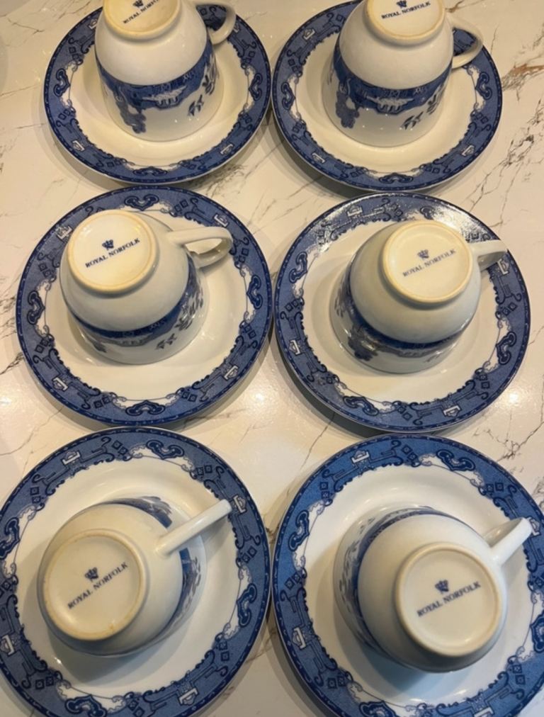 6 sets Vintage Royal Norfolk Blue and White Cups & saucers.