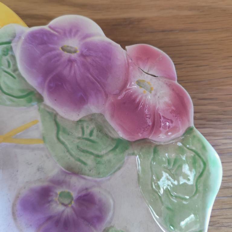 This piece unfortunately shows evidence of repair, second flower (pink) right hand side and a small chip to the bottom left middle - see photos.