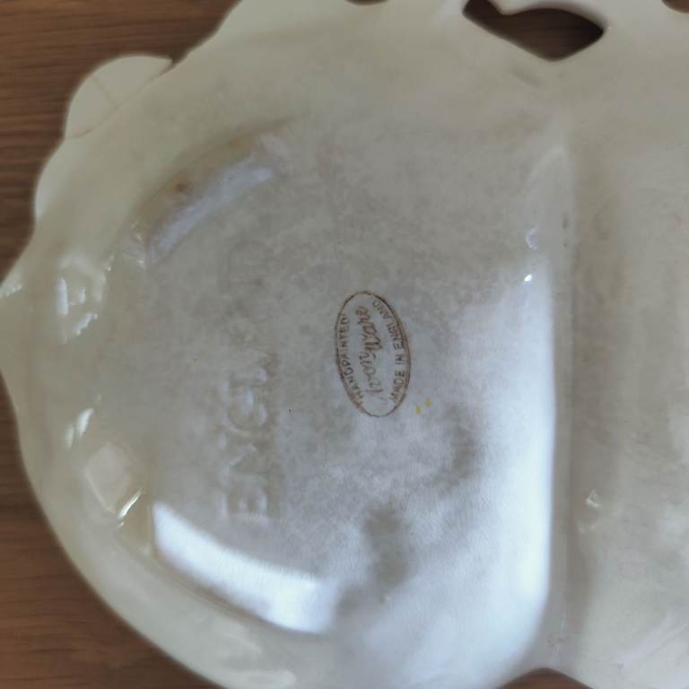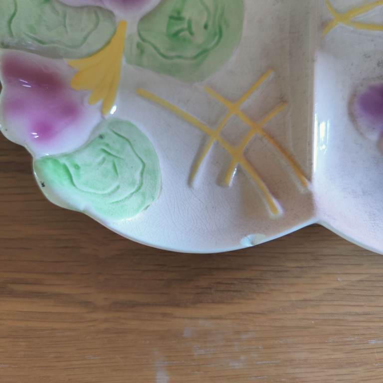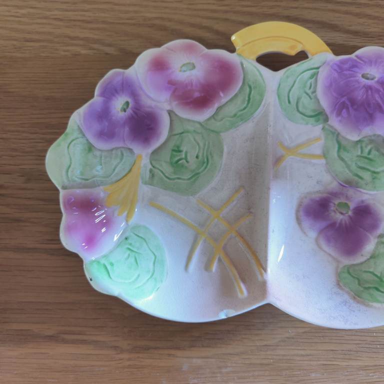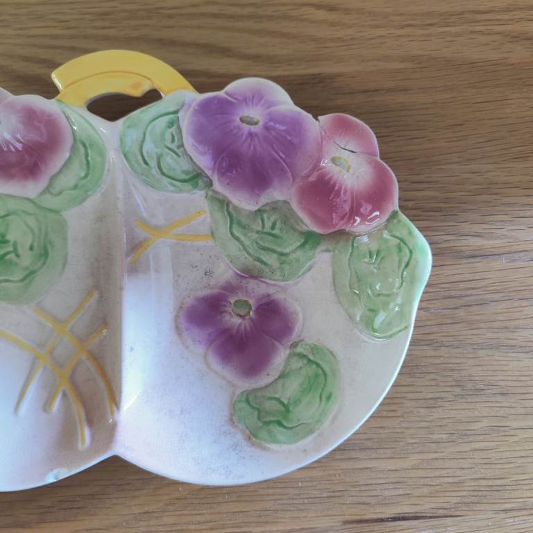 This is a gorgeous piece of Avon Ware crockery made in England back in the 1940s. This platter is divided into two sections showing beautiful pastel flowers and shrubbery in mauve, pink, yellow and green.