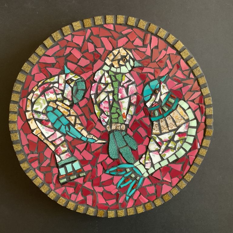 10 inches across, A rotating bird plate stand, handmade with mosaic