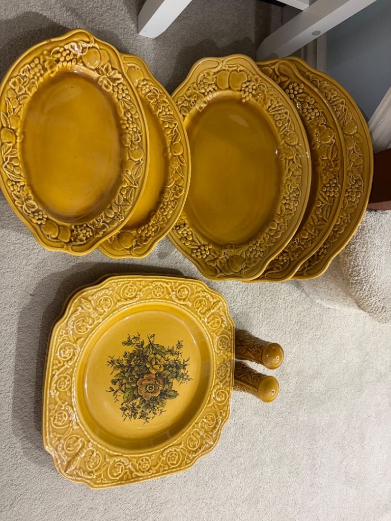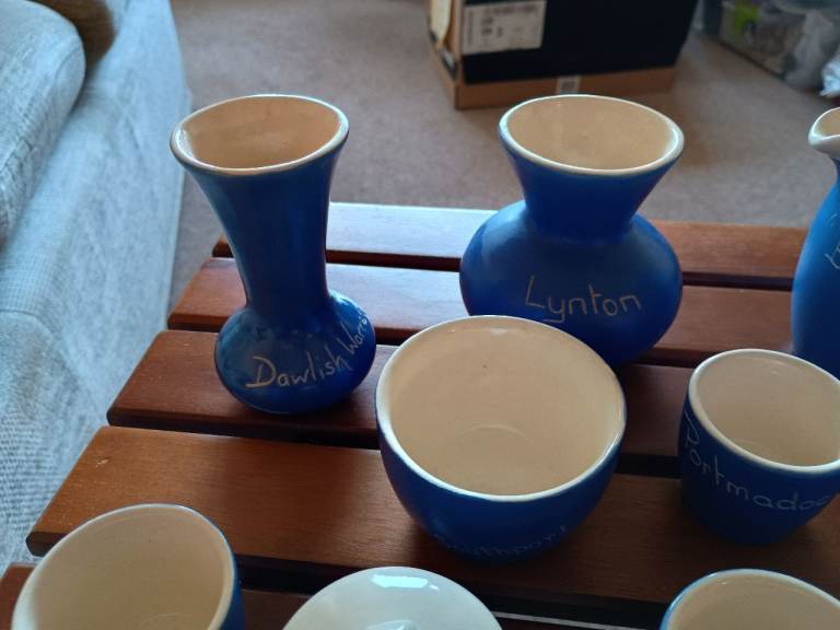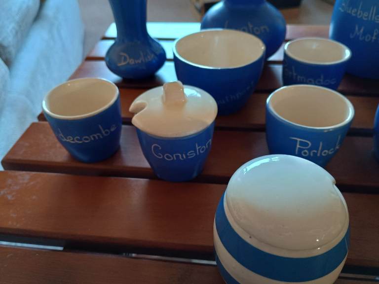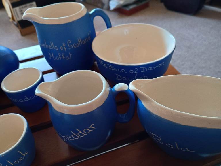 Vintage blue and white ceramics collected from around the UK. 3 jugs, 1 bowl, 4 egg cups, 2 small vases and a mustard pot (no spoon).