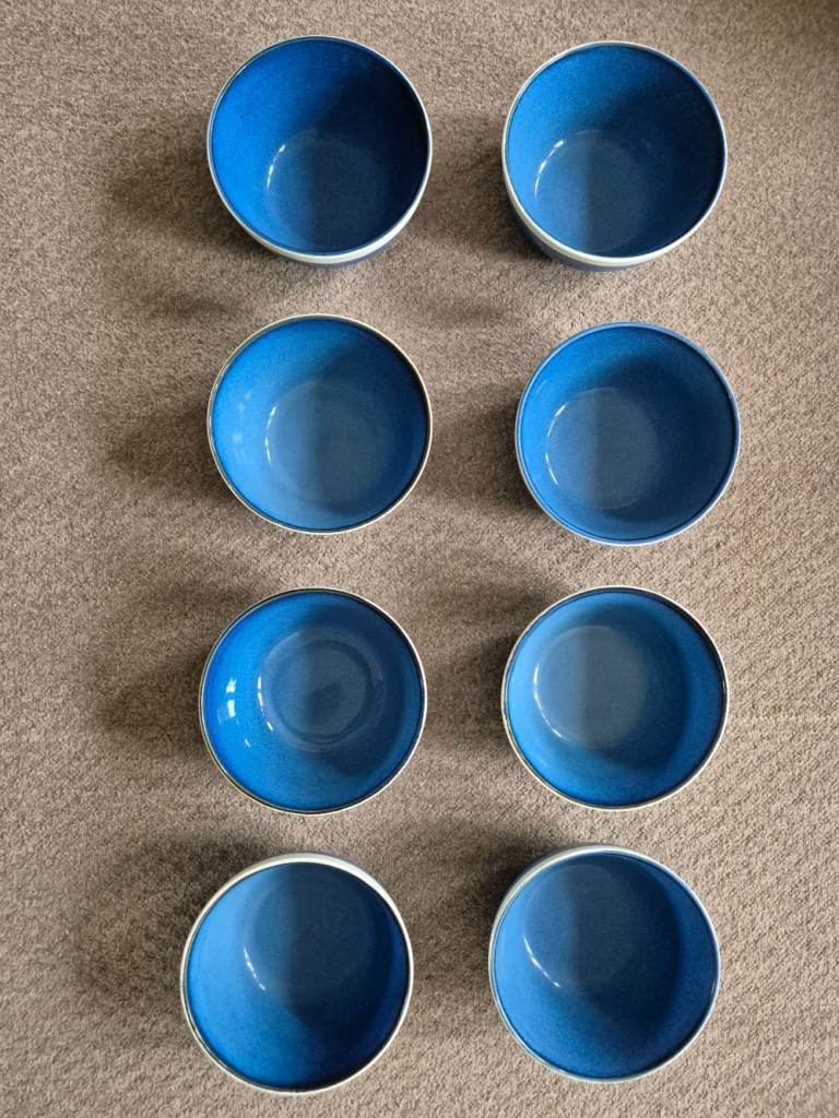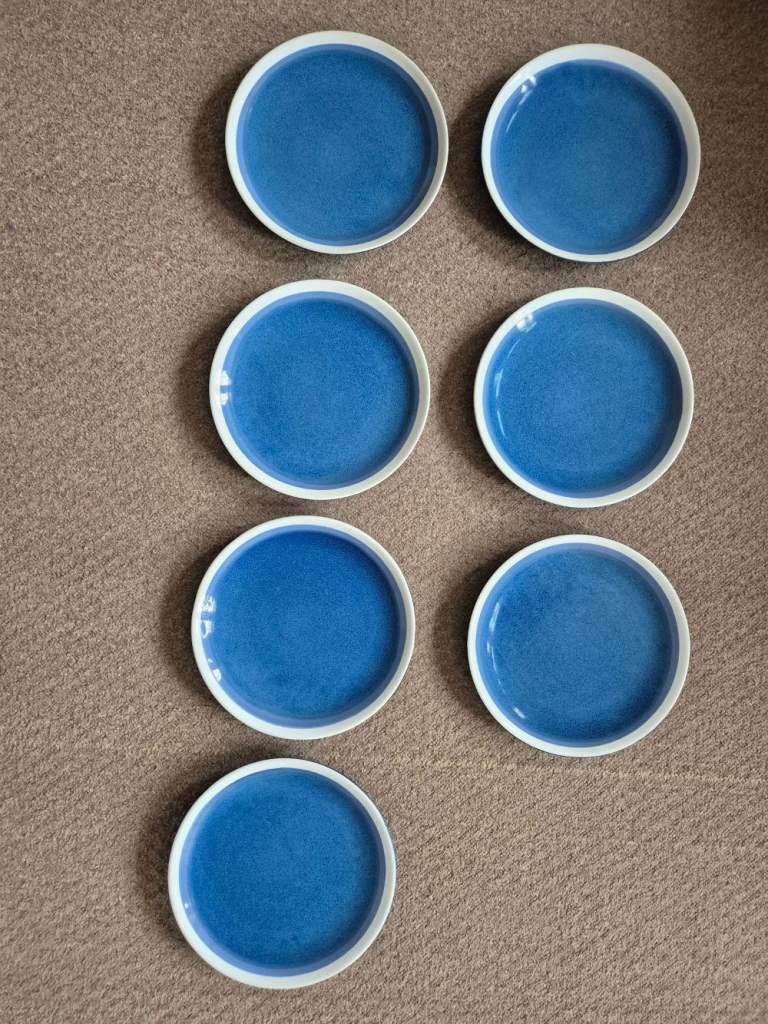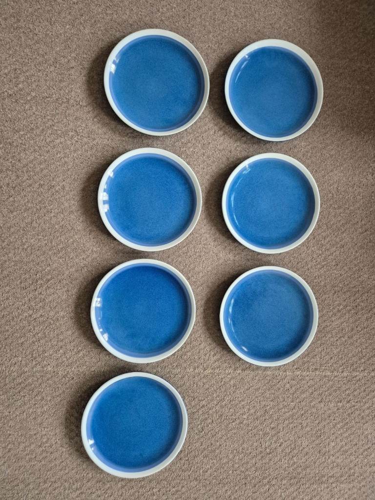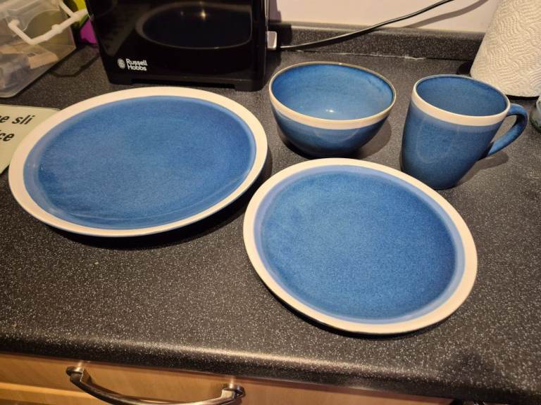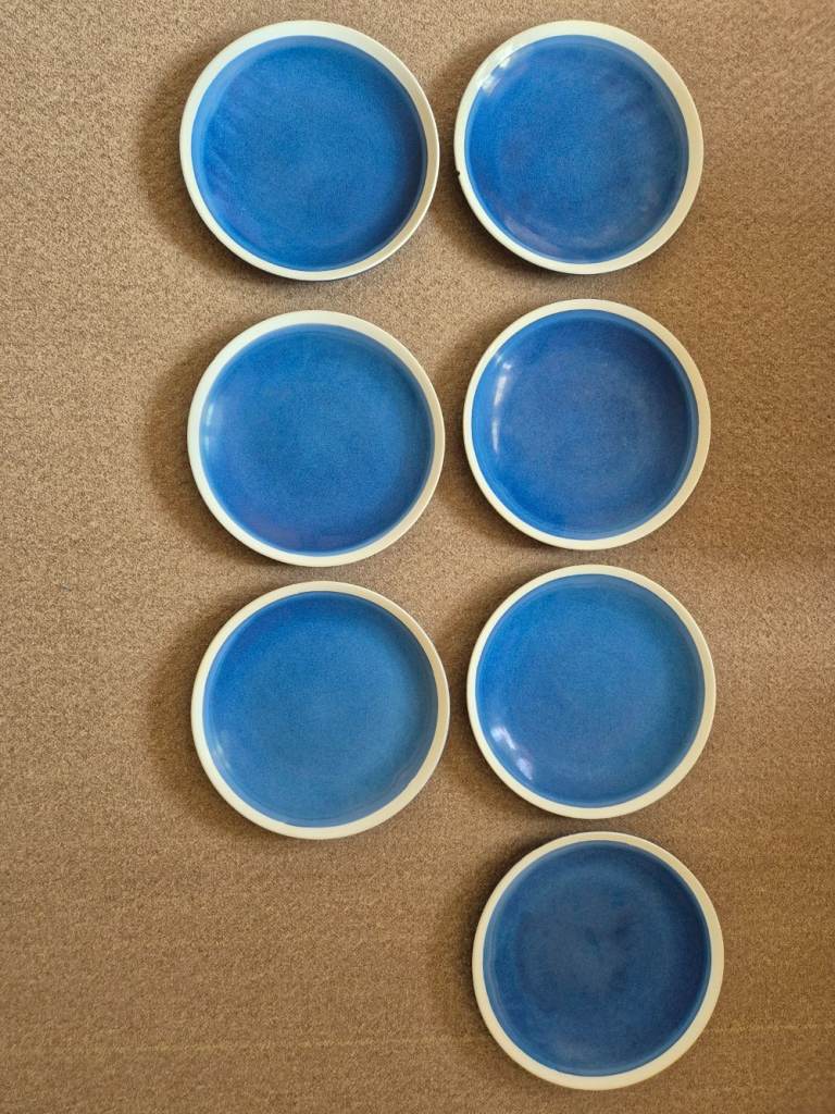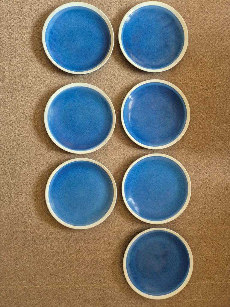 Blue Sahara stoneware dinner set - 7 plates, 7 side plates, 8 bowls, 8 mugs and 2 pasta bowls - now rare. Originally purchased from Tesco as 2 sets of 12-piece limited-edition stoneware plus 8 mugs and 2 pasta bowls. One dinner plate and one side plate did get broken. I've been told we are changing our colour style in the kitchen and so we need new ones!!