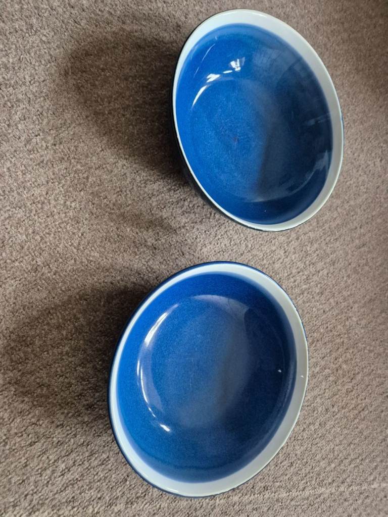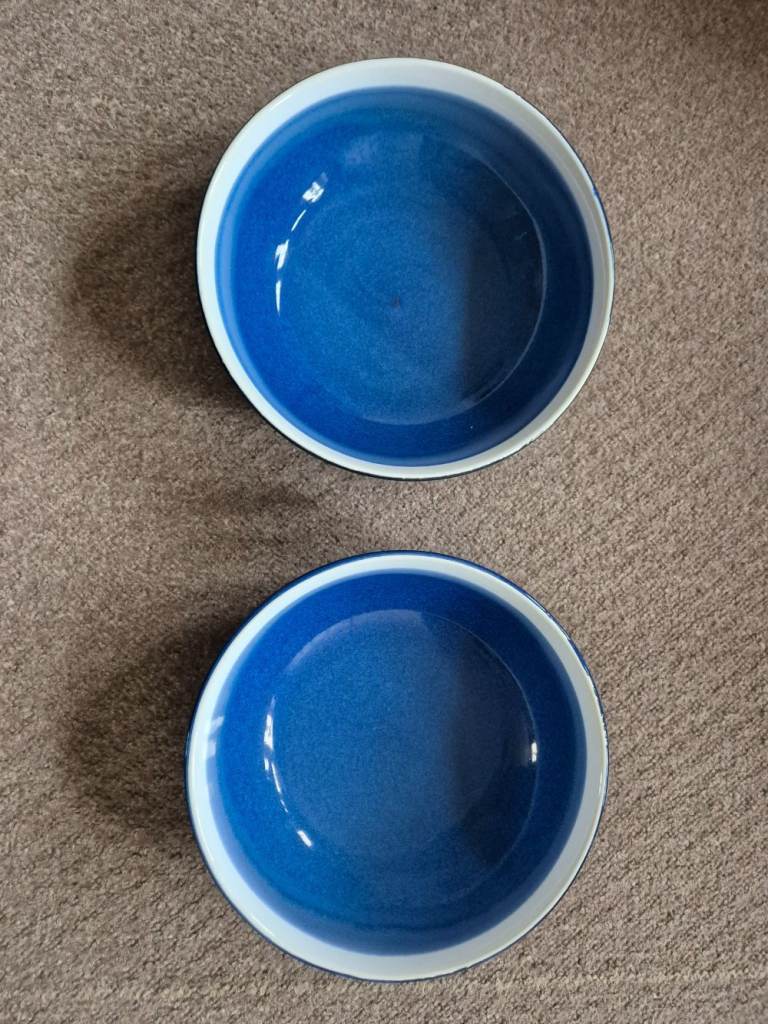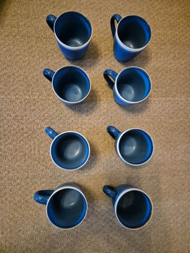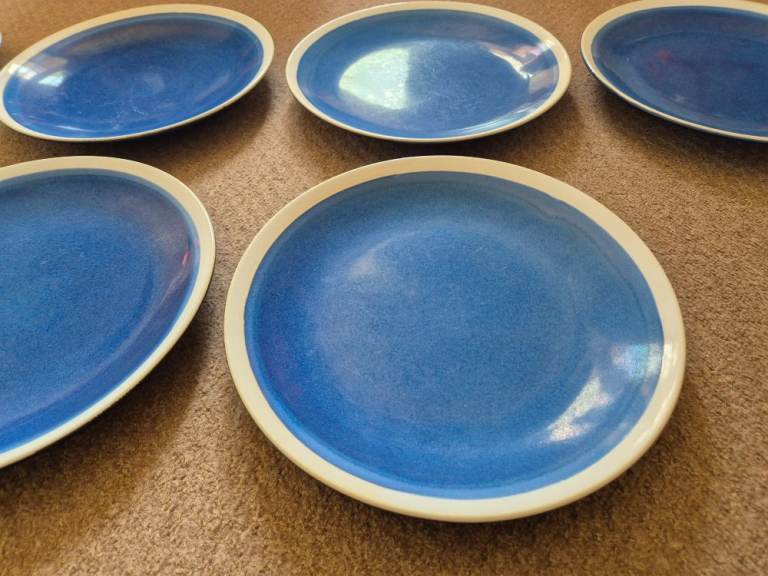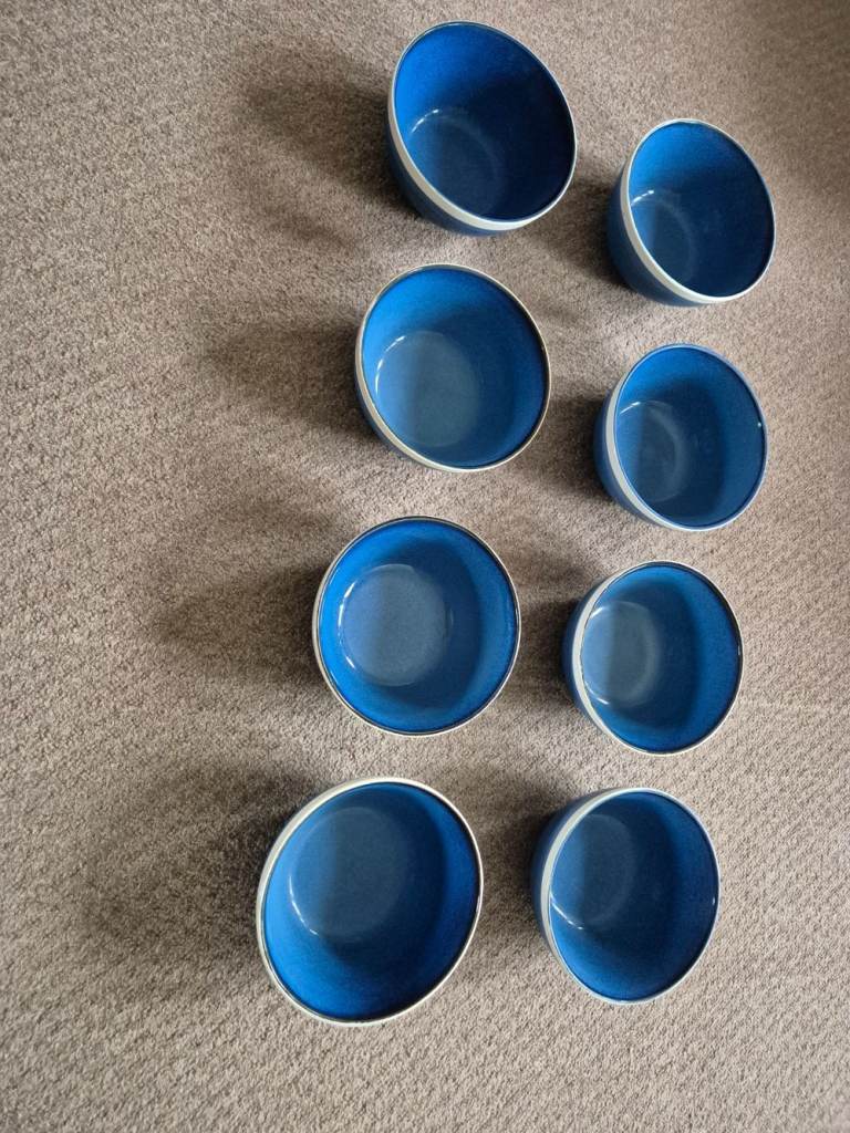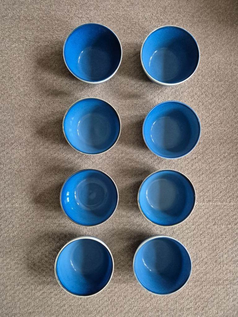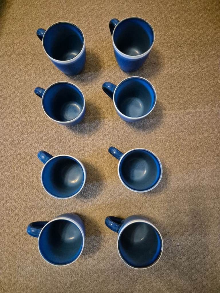 Blue Sahara stoneware dinner set - 7 plates, 7 side plates, 8 bowls, 8 mugs and 2 pasta bowls - now rare. Originally purchased from Tesco as 2 sets of 12-piece limited-edition stoneware plus 8 mugs and 2 pasta bowls. One dinner plate and one side plate did get broken. I've been told we are changing our colour style in the kitchen and so we need new ones!!