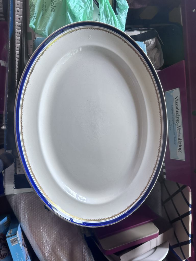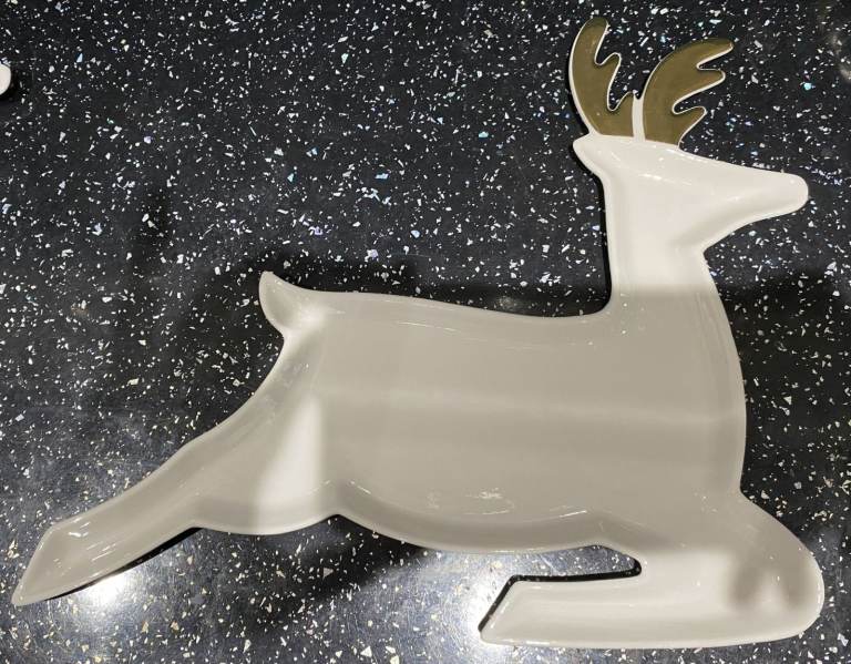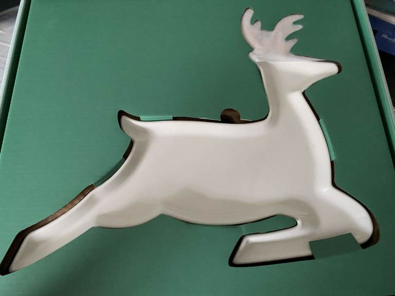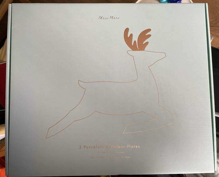 Brand new in box 2 porcelain reindeer plates, each measuring 32.25cm x 27.25cm/12.75" x 10.75". I'm asking £15 - they were £35 when I got them last Christmas and I never actually used them, so they are brand new and have only been out of the box to photograph. I've done my best with the photos - light at this time of year and the gold made them a bit awkward to get decent light!