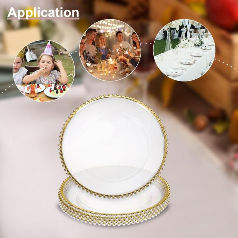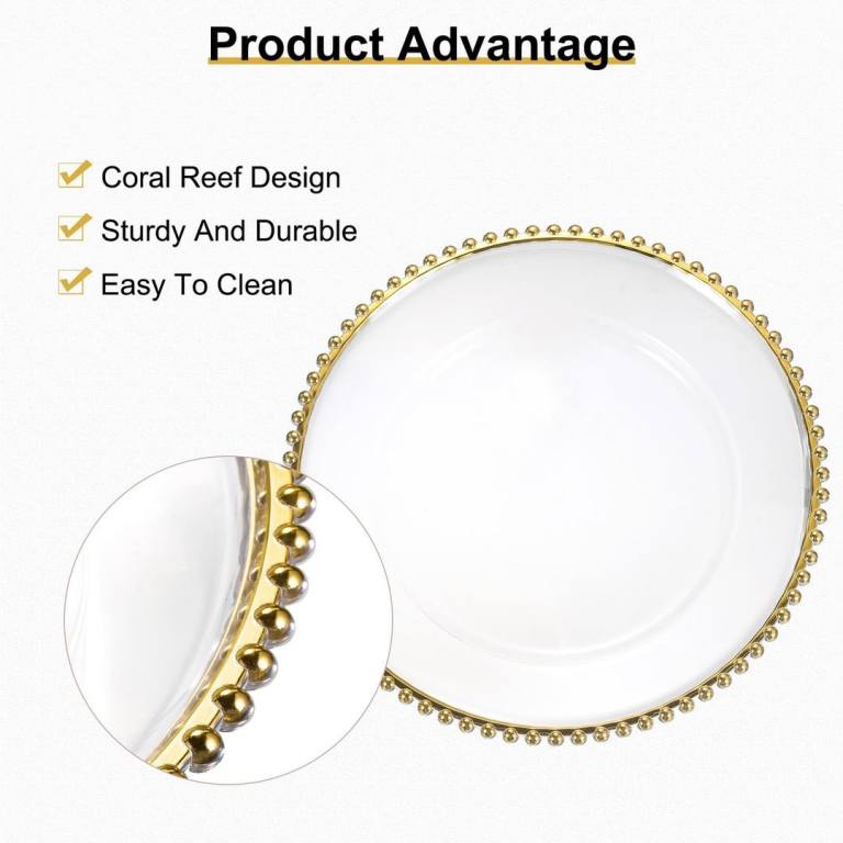 The product is a set of 12 plastic clear chargers with bead trim plates, measuring 12 inches in height, diameter, length, and width.