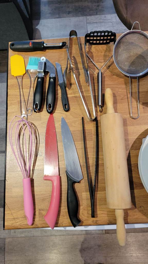 Different sized plates, 2 size knives, 2x cooking bowls, accessories for cooking, peeler etc. for sale. All used but in a good condition.