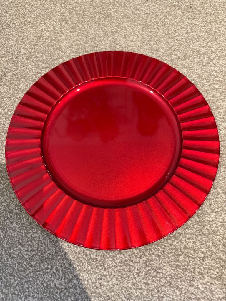 Various colours and styles of charger plates - teal, red, green, gold, silver, black and transparent colours.