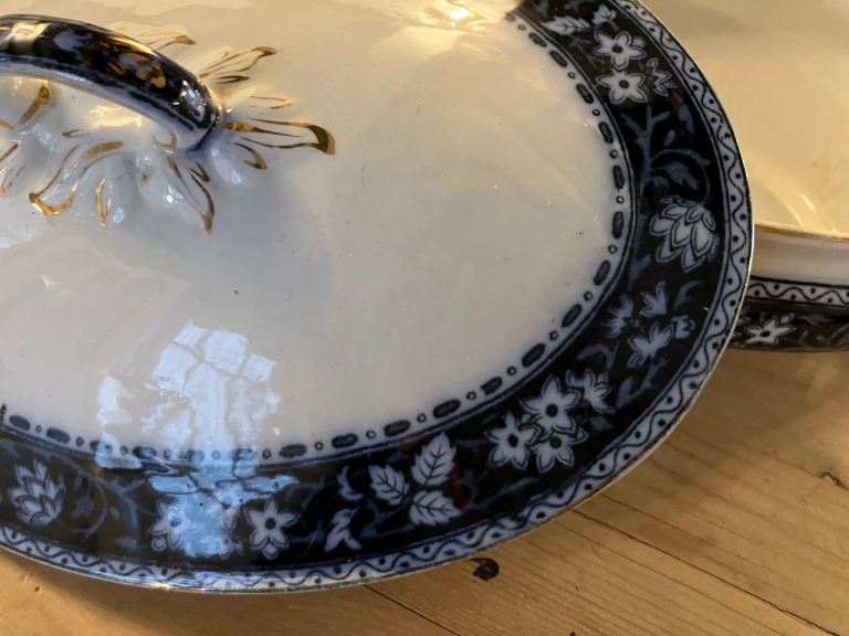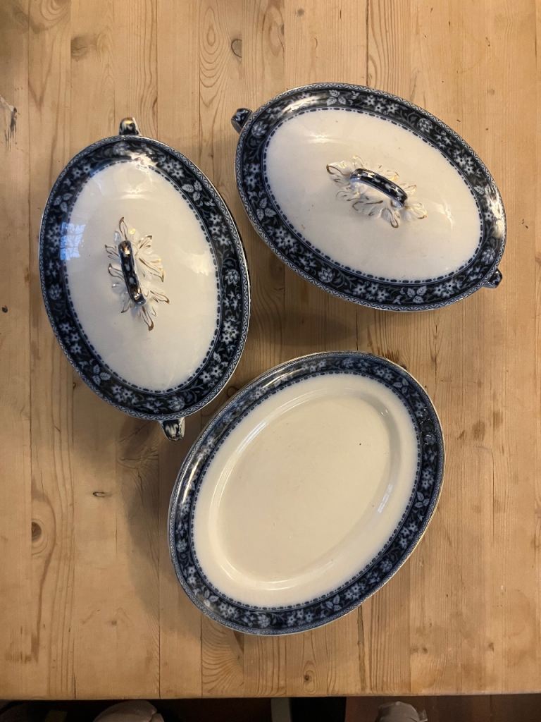 Navy blue white and gold china serving dishes with lids and matching plate. Ideal for roasts and veggies.