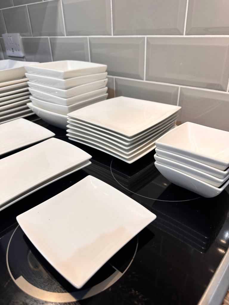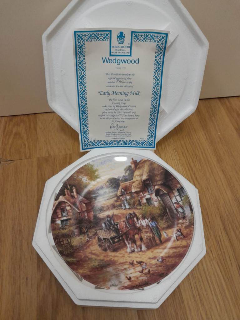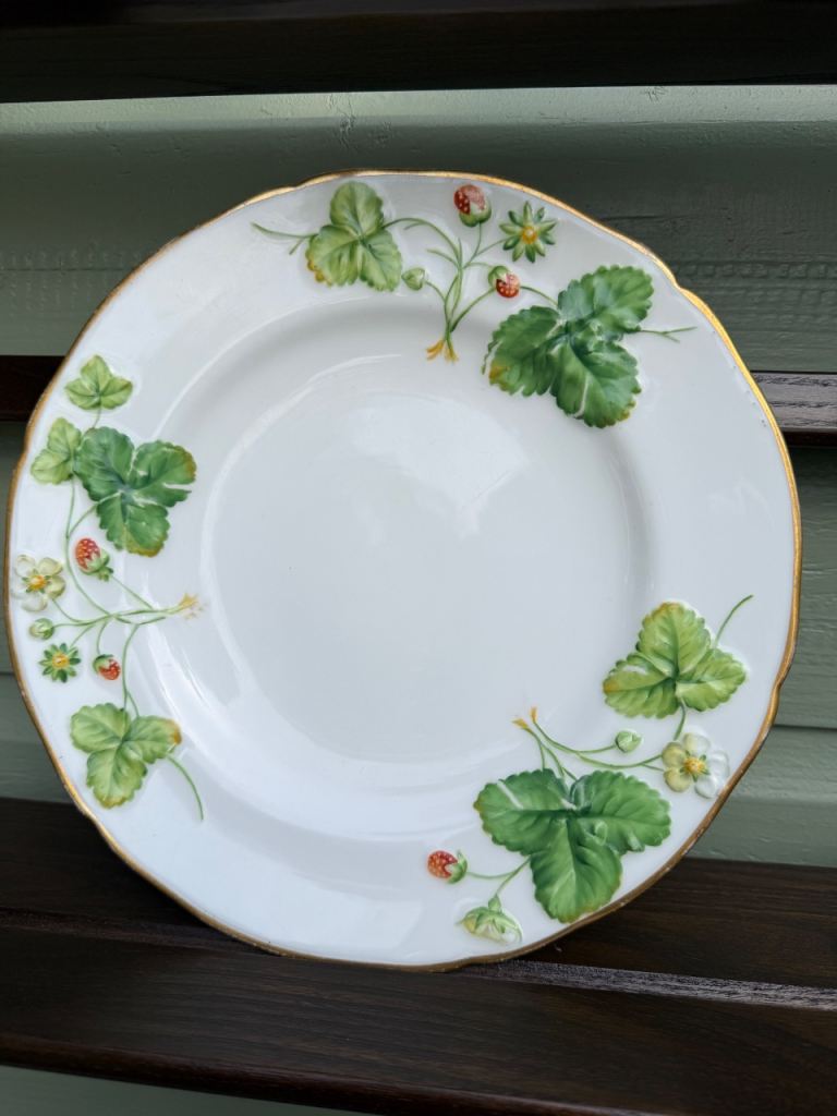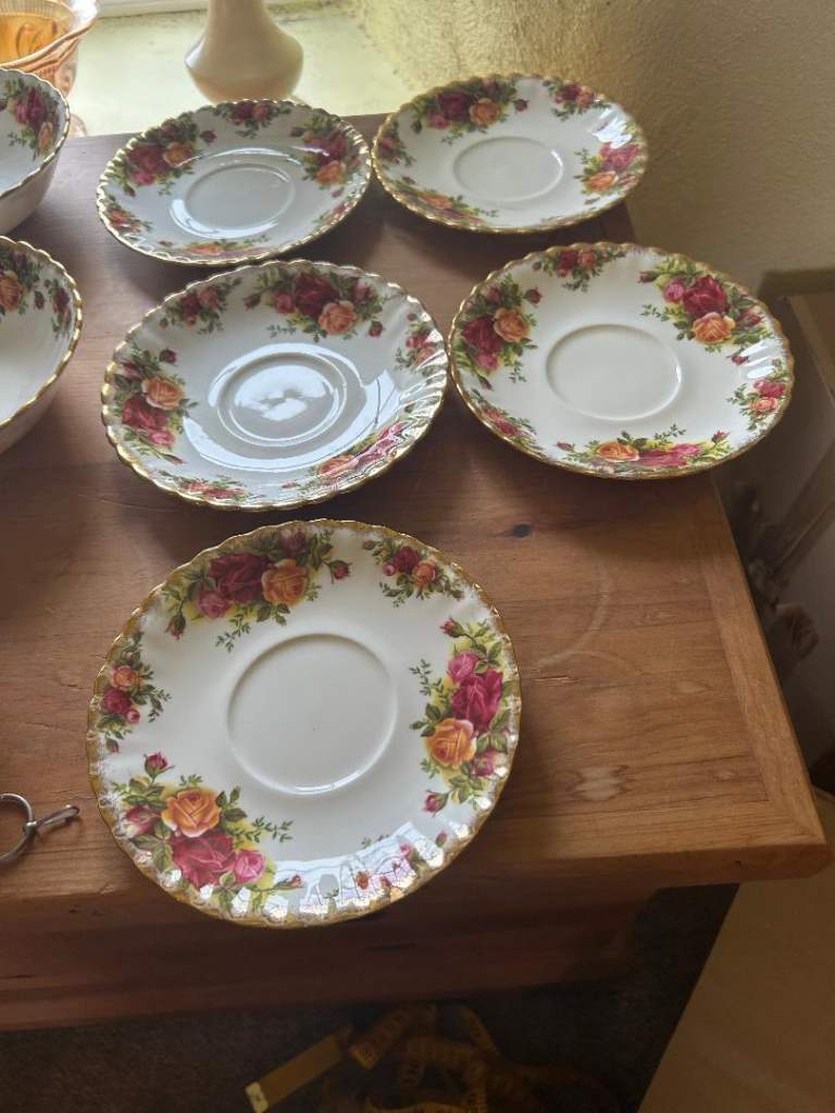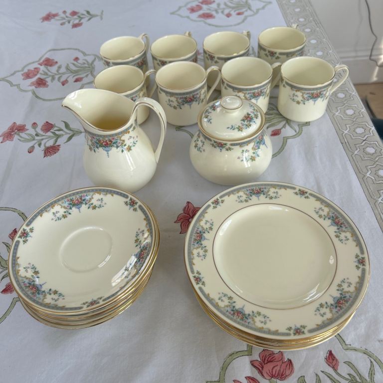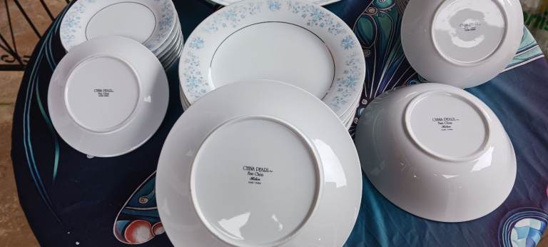 China Pearl Fine China in Helen pattern blue floral with Silver ring, made in Liling China, part set of Eight Large Plates, eight side plates, eight soup bowls, one serving plate and a serving bowl plus a teapot, purchased in the American China fleet club in Hong Kong in 1989 by myself, they have never been used and have been boxed up in storage.