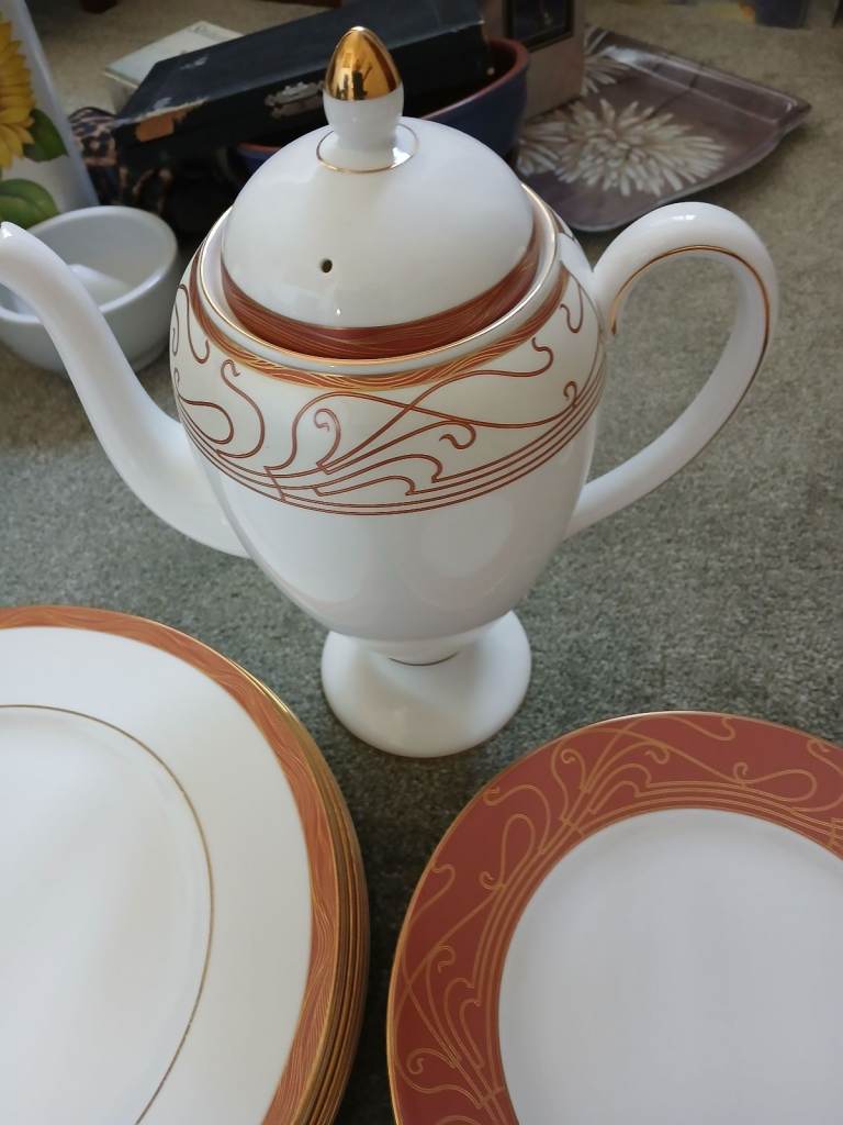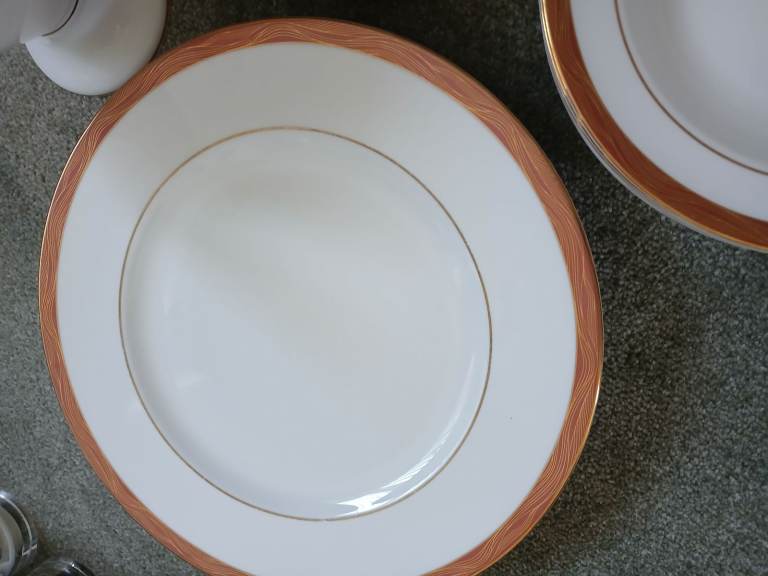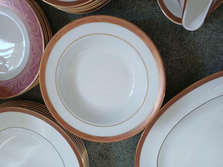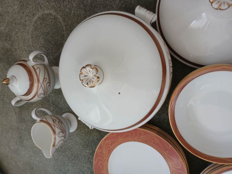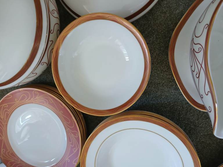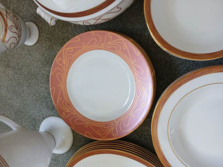 6 dinner plates 6 side plates 6 soup bowls 6 dessert bowls 6 coffee cups 6 saucers 6 cake plates sauce boat and plate serving platter serving bowl and 2 lids large coffee pot cream jug and lidded sugar bowl. This is a very expensive set dishes which is being sold for half of what was paid