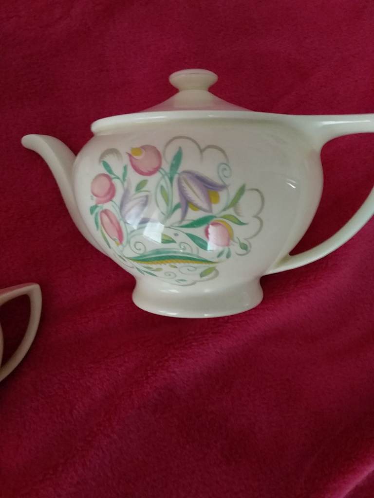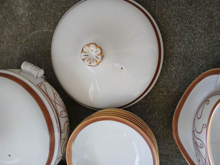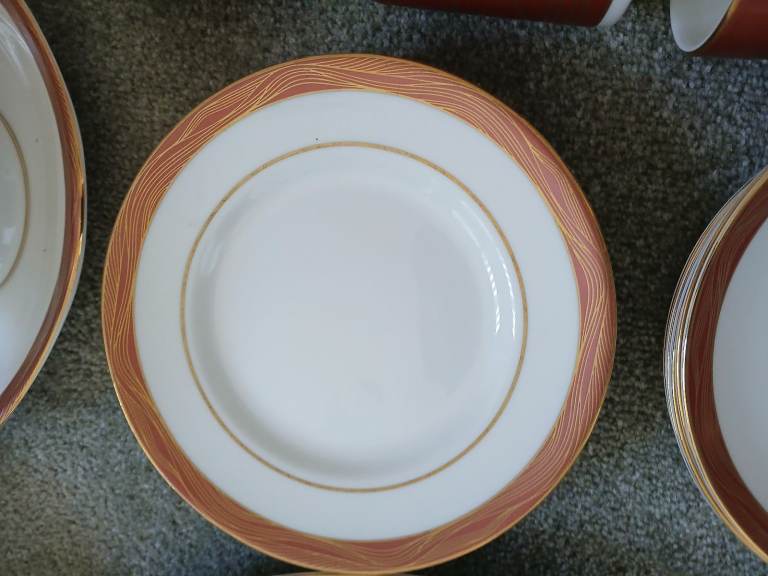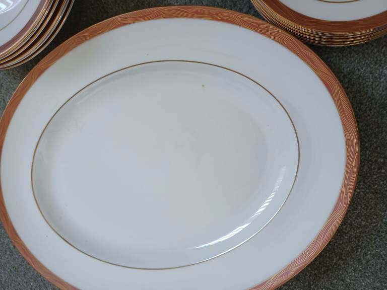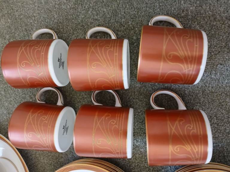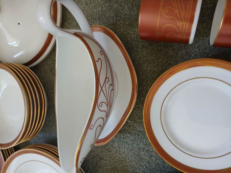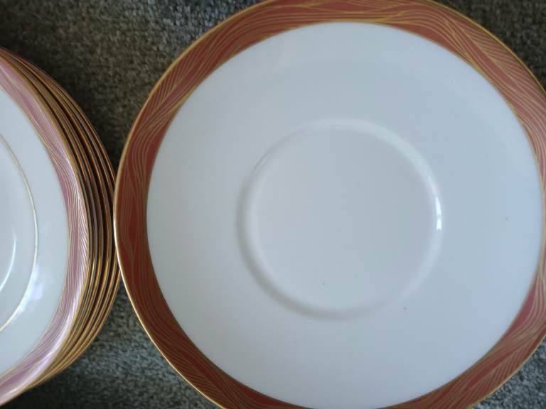 6 dinner plates 6 side plates 6 soup bowls 6 dessert bowls 6 coffee cups 6 saucers 6 cake plates sauce boat and plate serving platter serving bowl and 2 lids large coffee pot cream jug and lidded sugar bowl. This is a very expensive set dishes which is being sold for half of what was paid