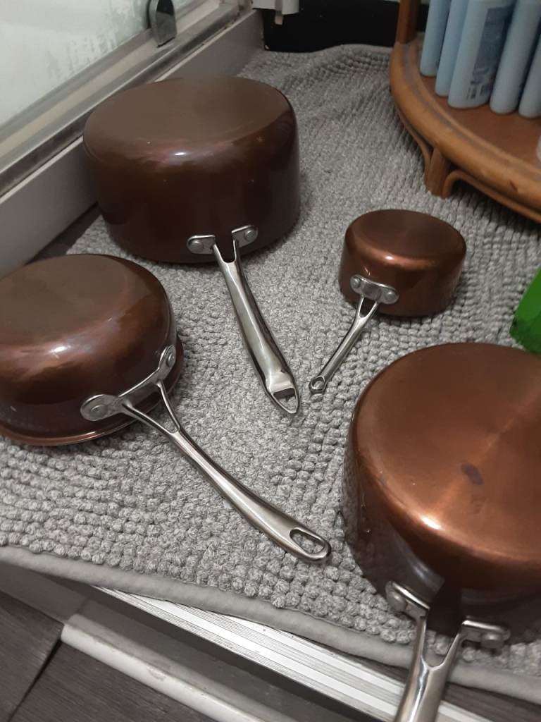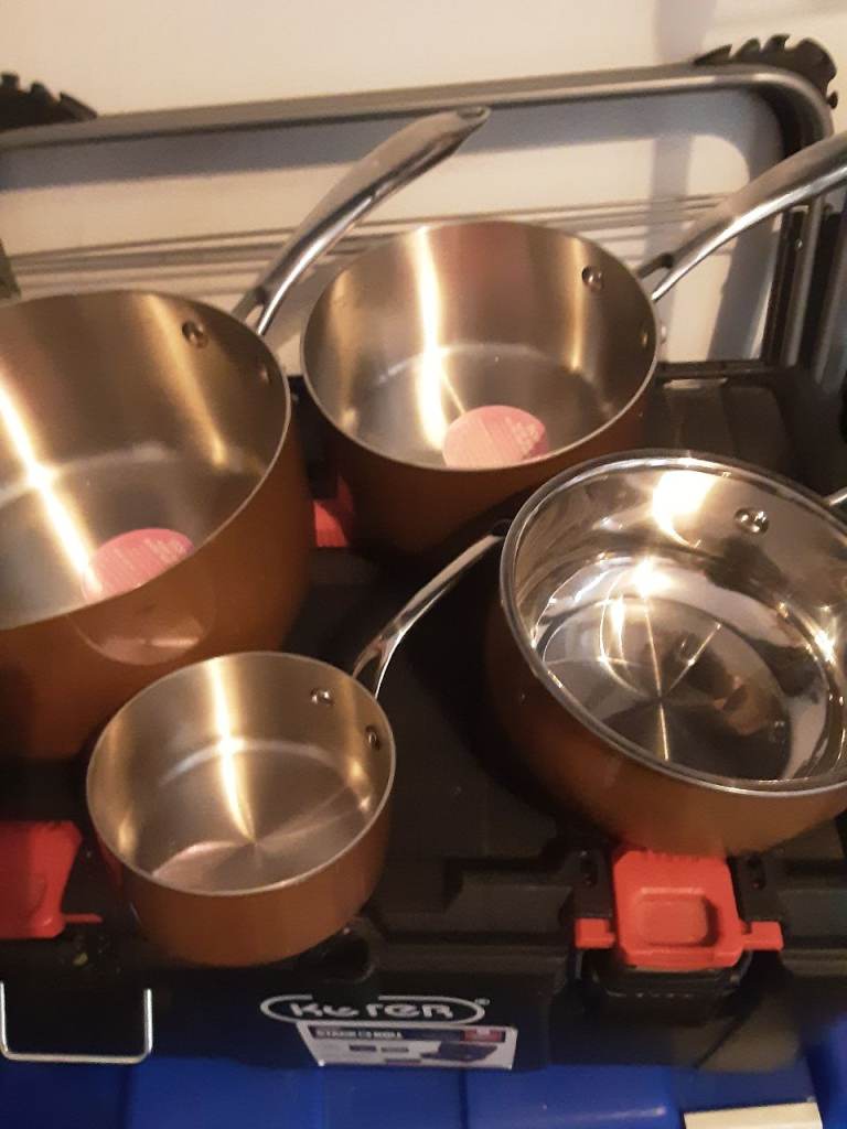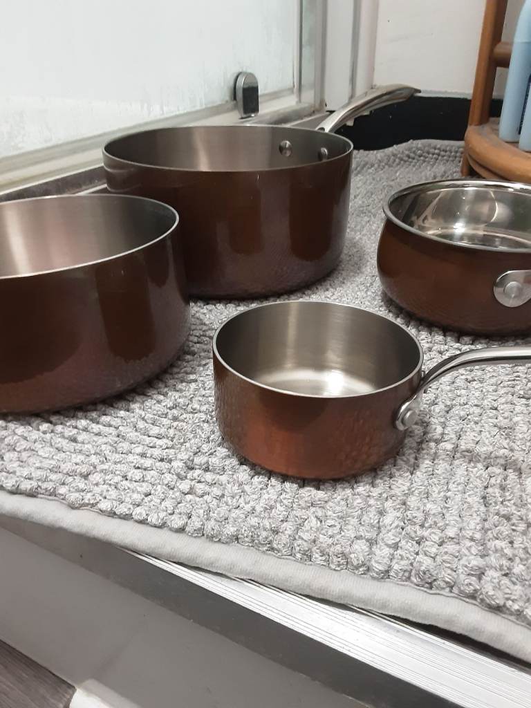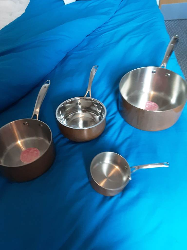 Copper clad stainless pan set,infi ity on large pan no lids but never used sizes are 20cm ,16cm,14cm,10cm see pics for condition details.