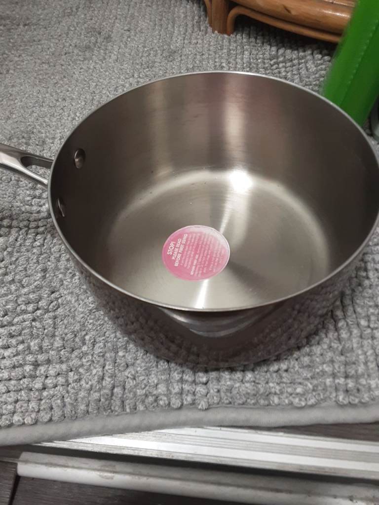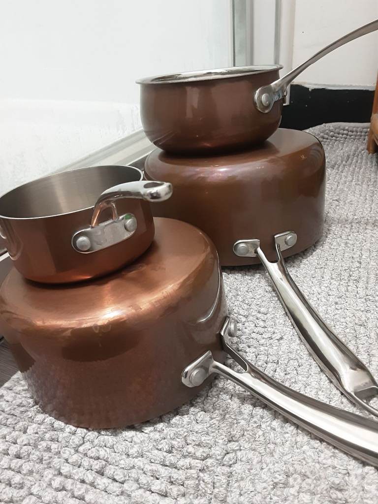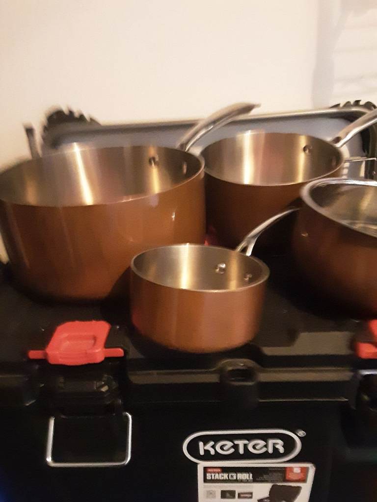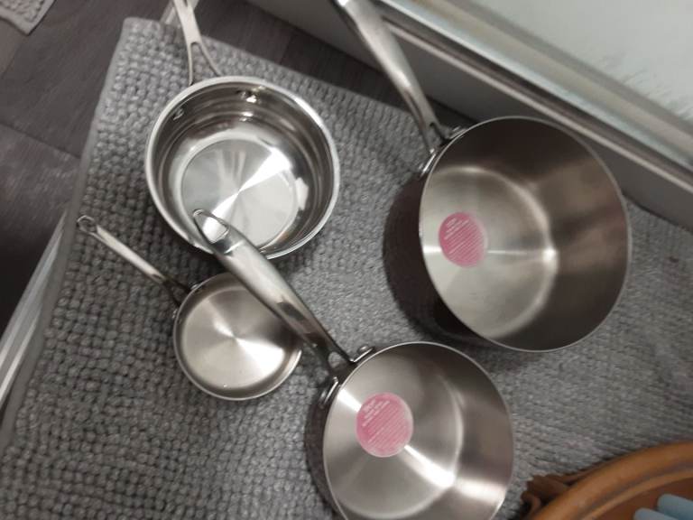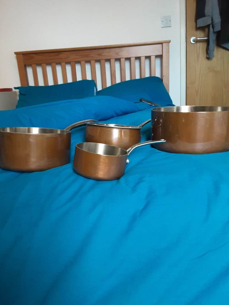 Copper clad stainless pan set,infi ity on large pan no lids but never used sizes are 20cm ,16cm,14cm,10cm see pics for condition details.