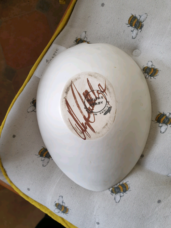 This particular example has a cream background and exterior with the interior of the bowl decorated with a many coloured leaf pattern. It is signed on the base (see pics) by the designer Glyn College.
