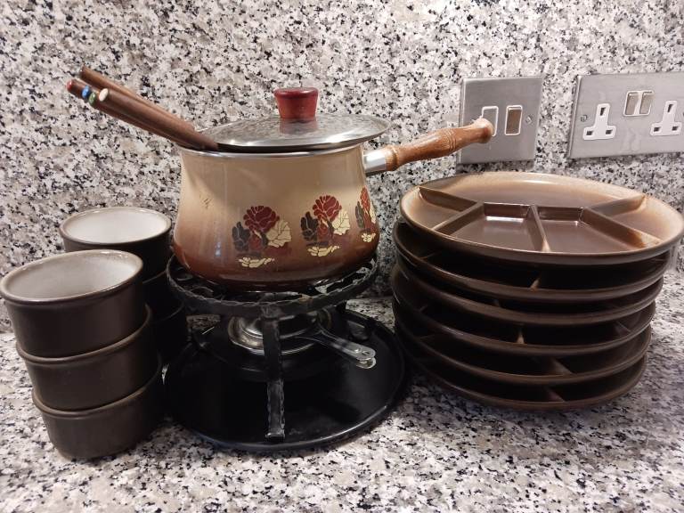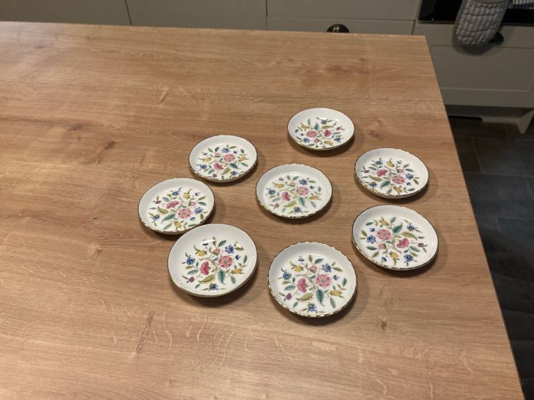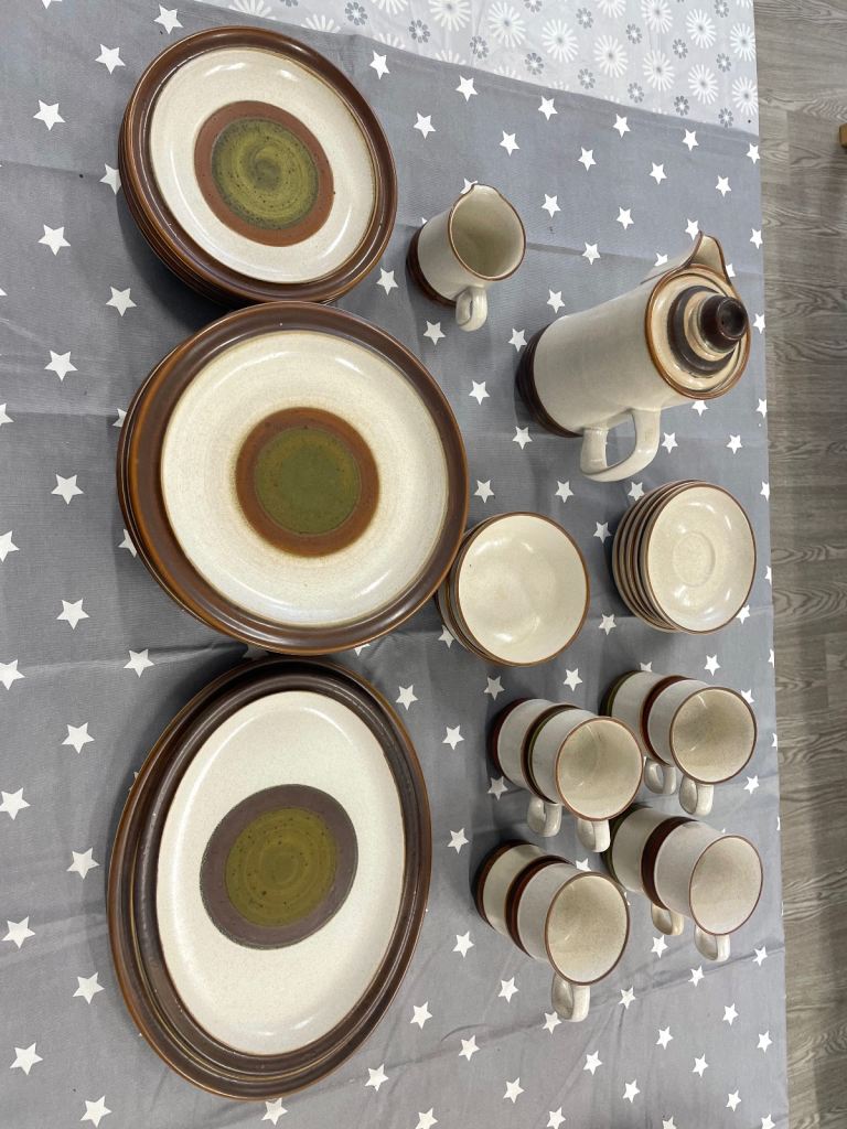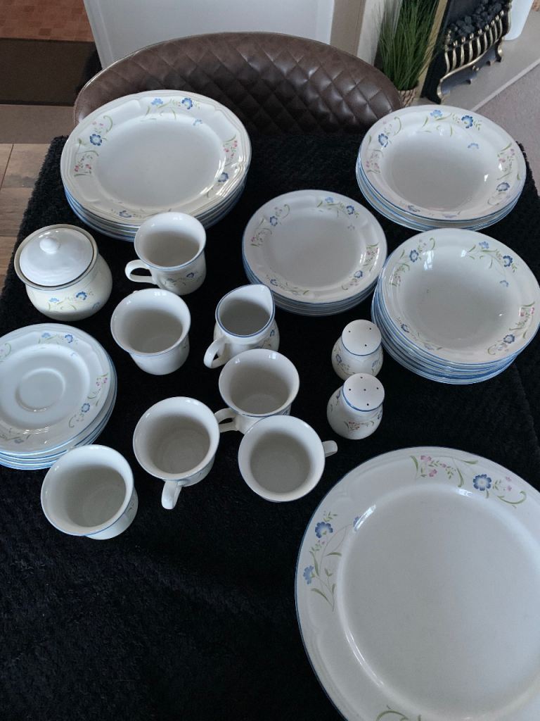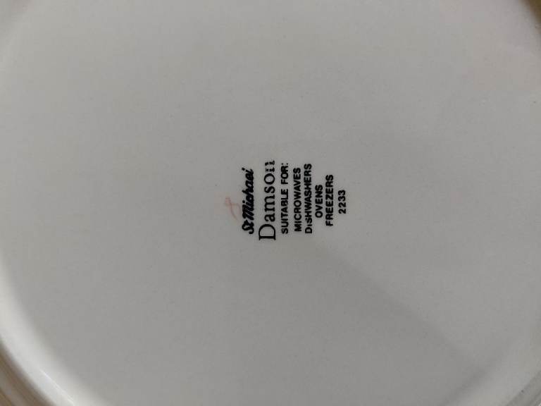 M&S "Damson" design. 7 place setting (dinner plates, desert plates and bowls), 4 serving dishes and a trifle bowl. Glaze on plates slightly dull in centre but not really noticeable. A few plates have minor chips on rim but again, not obvious.
