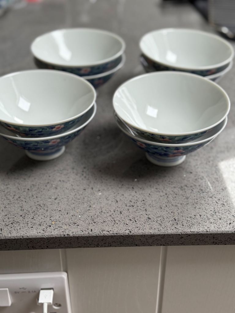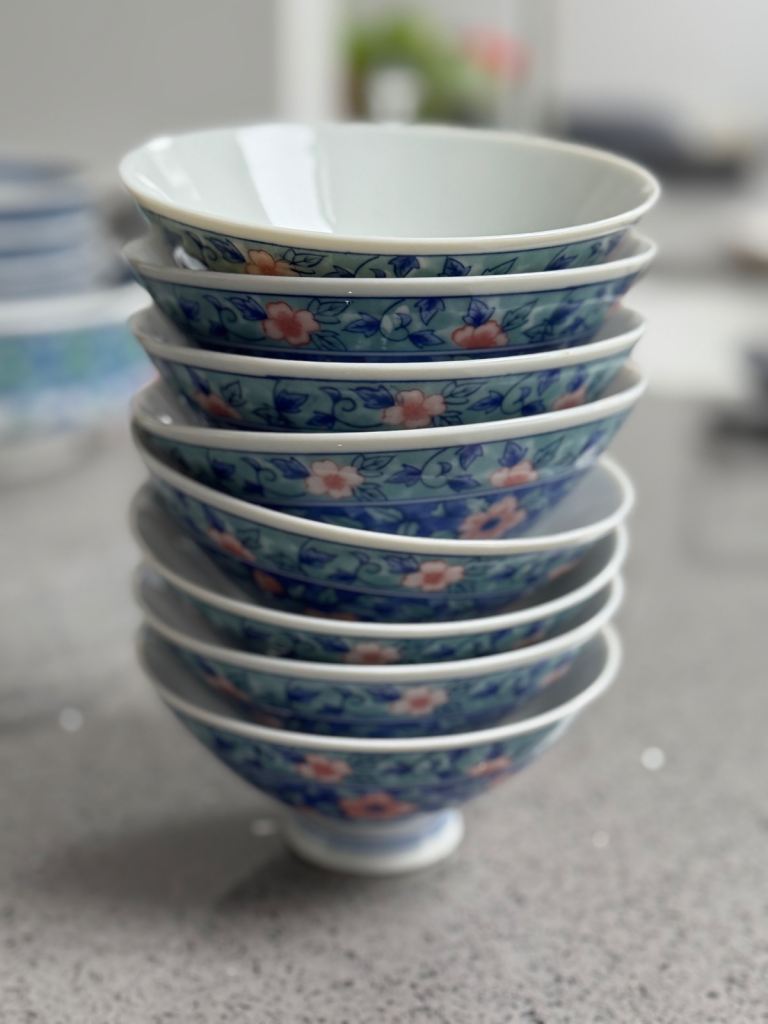 This set of collectible vintage Japanese cobalt blue floral footed rice bowls features a traditional delicate pattern and footed base design.