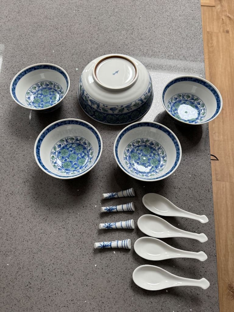 Blue & White ceramic, 1 large bowl & 4 smaller rice or soup bowls with 4 matching chopsticks rests & spoons