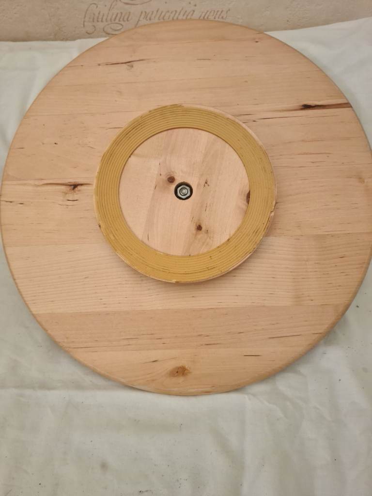 Wooden turntable rotates 360°. Measures 39cm can be used indoor or outdoor.