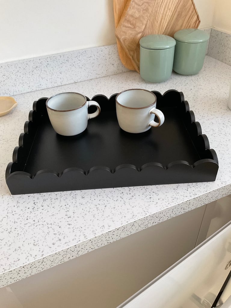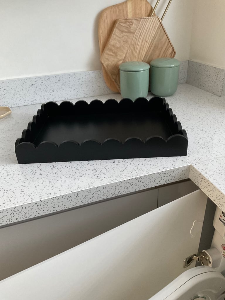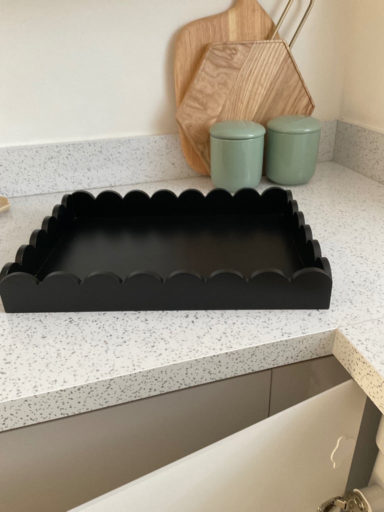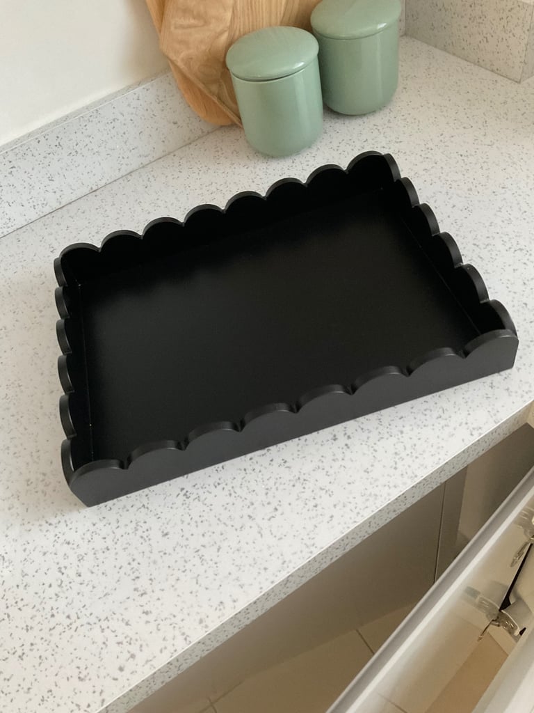 A new black scallop tray , ideal for lounge kitchen coffee tables worktops stunning design can be used as a decorative tray in any room . Size 40 cm x 30 cm