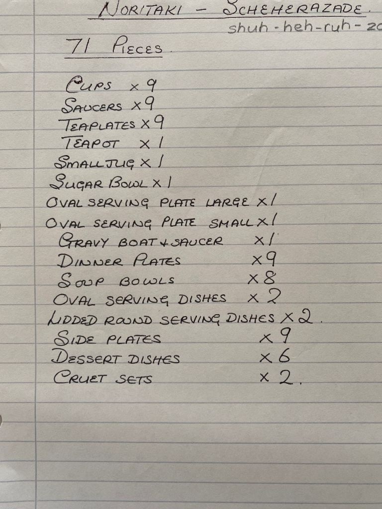 Huge collection of Noritaki Scheherazade dinner and tea service. Beautiful design and fantastic quality! 71 pieces in total as listed. All in excellent condition. Collection only.