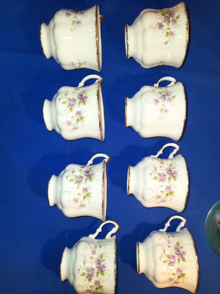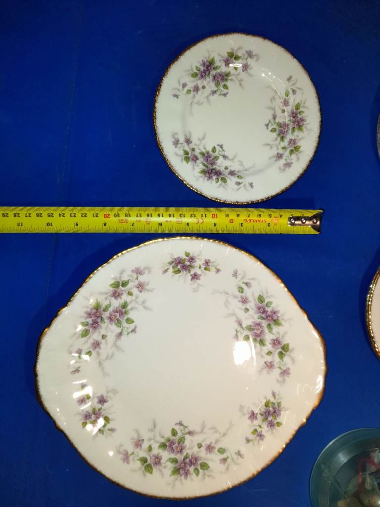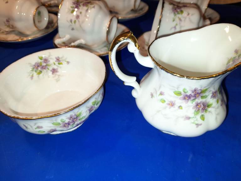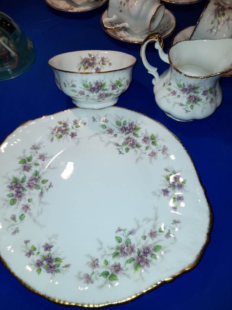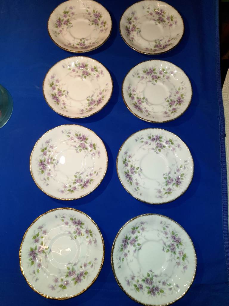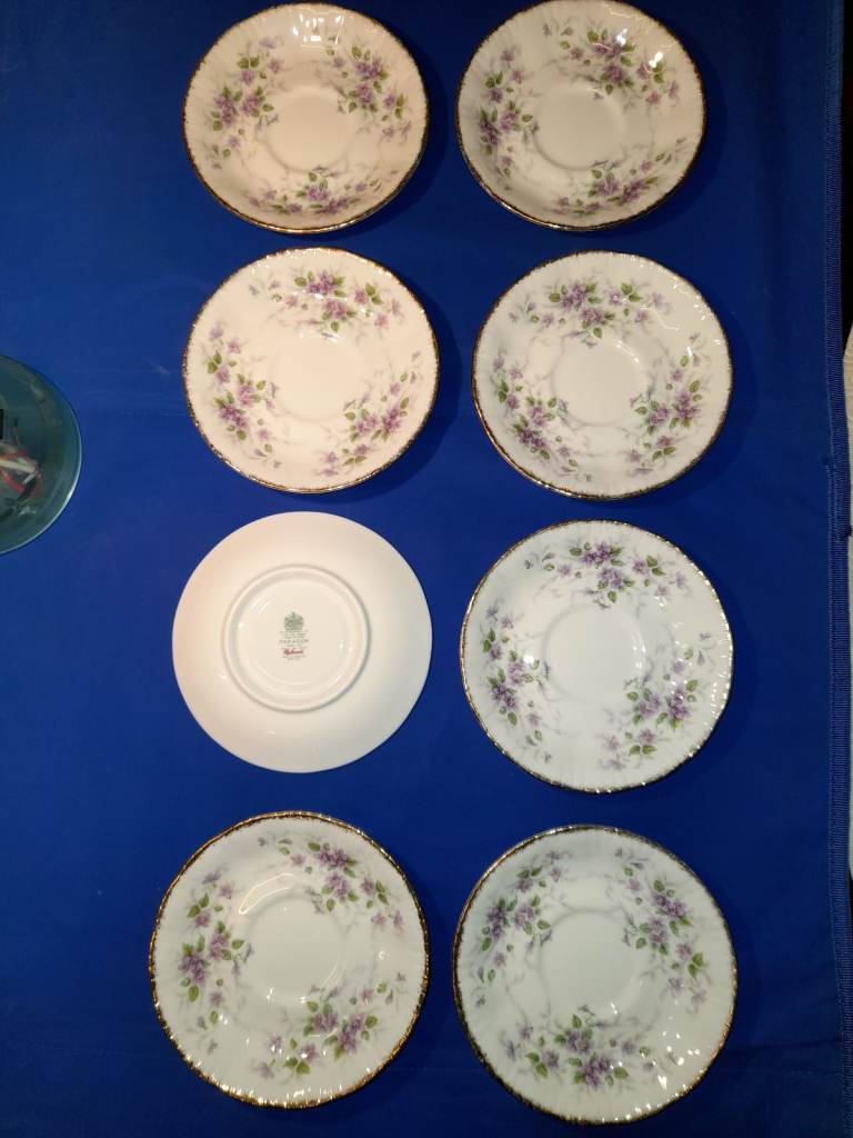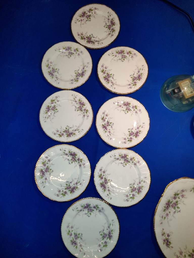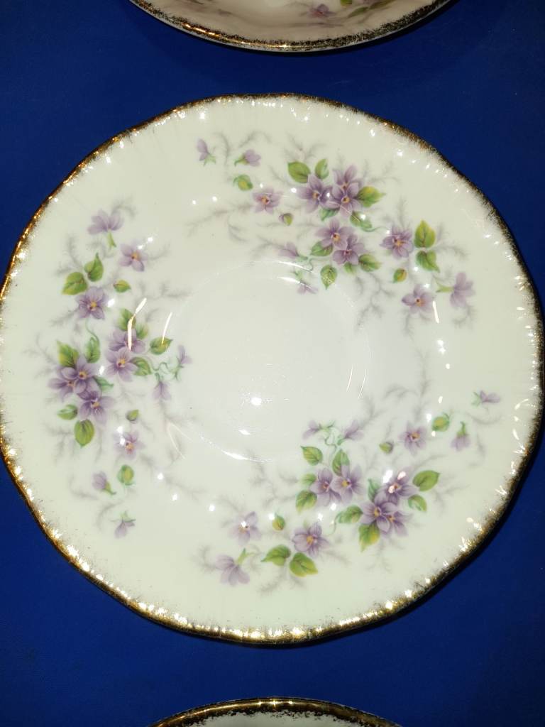 The pattern features a delicate floral design with purple violets, green leaves, and gold accents. This pattern is known for its transfer ware decoration with hand-finished details.
