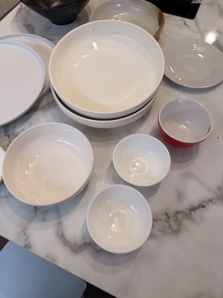 Mixture of pasta bowls, cereal bowls and serving bowls along with plates